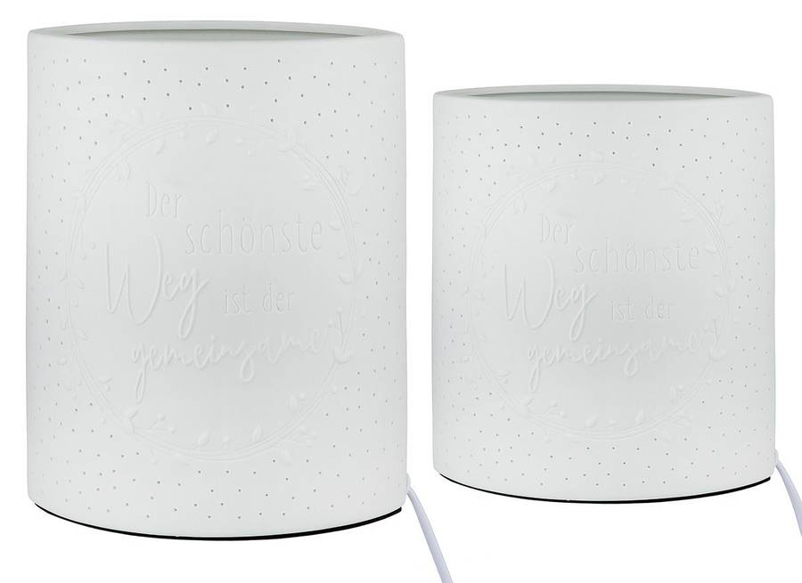Настольная лампа Самый красивый путь создаст в любой комнате теплую и уютную атмосферу. Изготовленная из тонкого белого фарфора, эта лампа очаровывает своим элегантным внешним видом и с любовью выполненной надписью: Самый красивый путь - это путь, которым делятся. Небольшие, незаметные отверстия пропускают мягкий свет, создавая приятное освещение, идеально подходящее для гостиных и спален. Благодаря своему вневременному дизайну эта лампа легко вписывается как в современный, так и в классический интерьер, предлагая не только функциональность, но и декоративную изысканность.