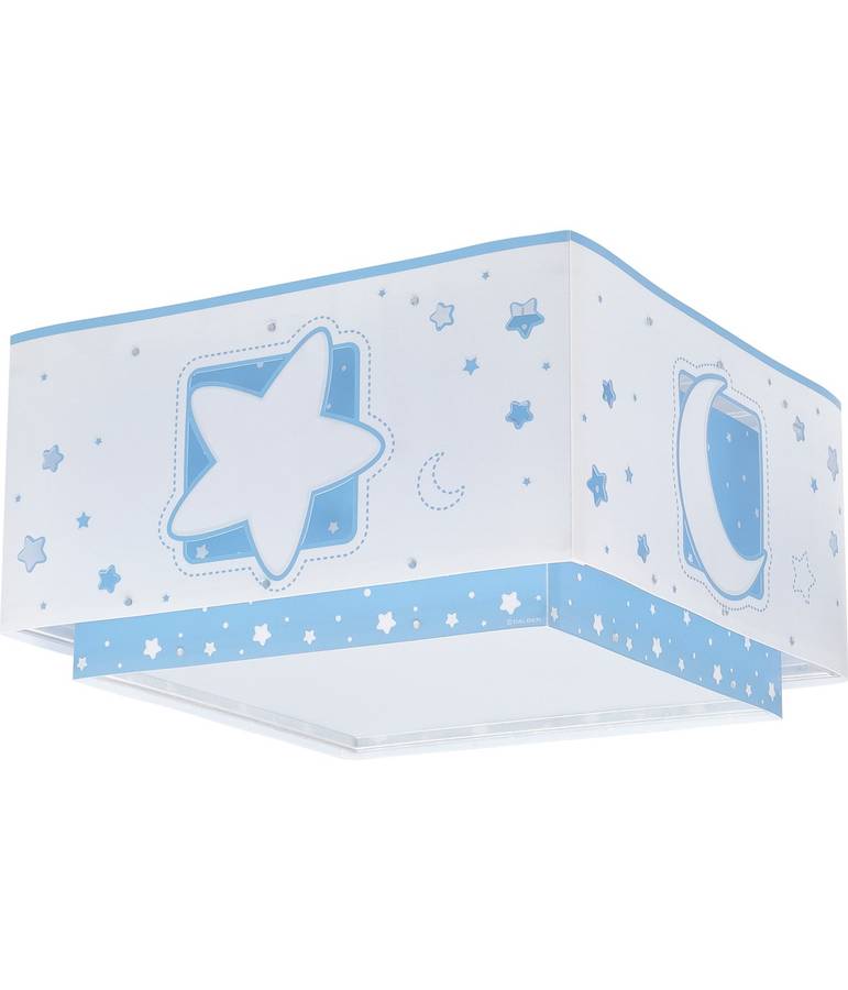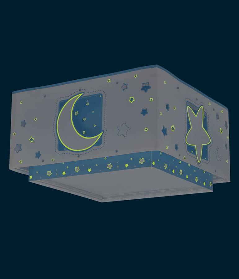 Потолочный светильник с 2 лампами и рисунком в виде луны и звезд синего цвета, выполненный из прозрачного двойного абажура с вырезанными мотивами и светящийся в темноте.