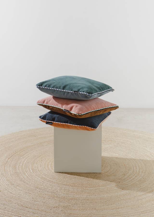 Двусторонняя подушка 45 x 45 см из вельветовой ткани, украшенная двухцветным шнуром.
