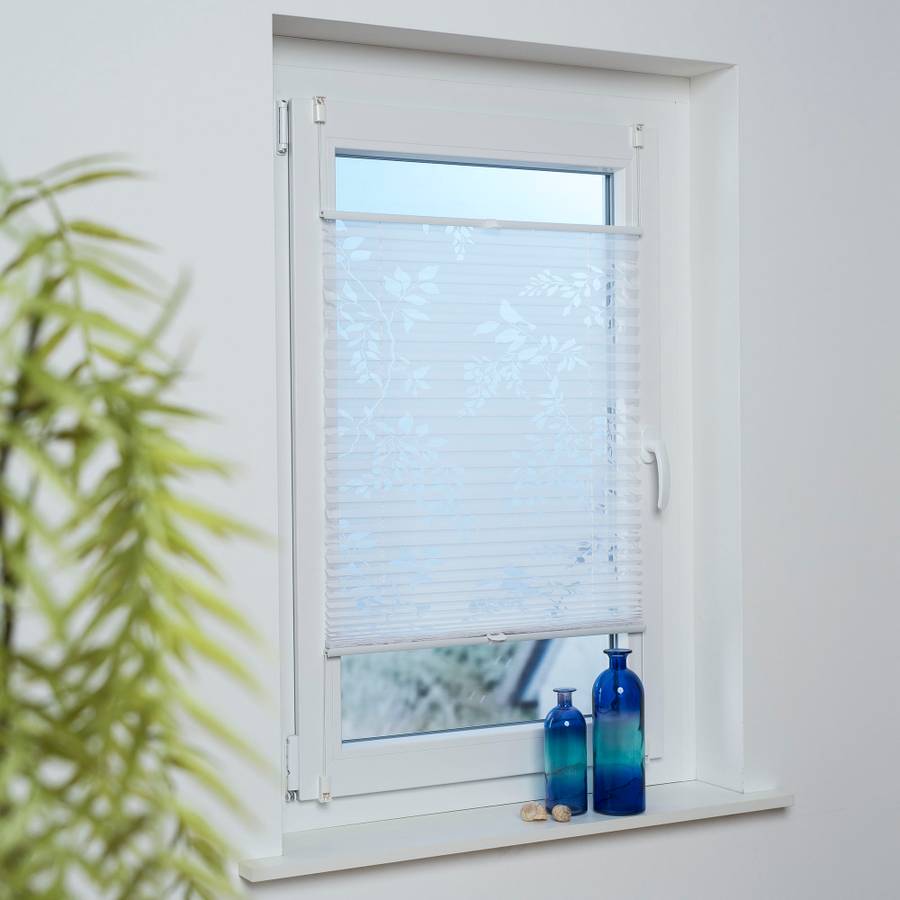 Эта белая плиссированная штора Klemmfix от Garesa с прозрачным мотивом в виде усиков листьев может быть установлена в различных положениях благодаря своей свободно перемещаемой конструкции. Эта плиссированная штора универсальна, будь то притягивающее взгляд украшение, экран для защиты от посторонних глаз или просто декоративный элемент. Однако она не предназначена для полного затемнения жилого помещения, а усики створок прозрачны. Установка: плиссированная штора крепится к оконной раме сверху и снизу с помощью входящих в комплект кронштейнов-зажимов. Это избавляет от необходимости сверлить или завинчивать. Кронштейны можно гибко регулировать, но толщина оконной рамы должна быть от 5 до 24 мм. Благодаря фиксация плиссированной шторы сверху и снизу, предотвращается ее качание при наклоне окна. Инструкция по измерению: Чтобы измерить ширину плиссированной шторы, выполните следующие действия: измерьте ширину стекла и прибавьте примерно 5 см. Обратите внимание на оконную ручку. Она не должна мешать работе плиссированной шторы. Для определения высоты измерьте высоту оконной рамы. Затем высоту плиссированной шторы можно легко отрегулировать в соответствии с окном дома.
