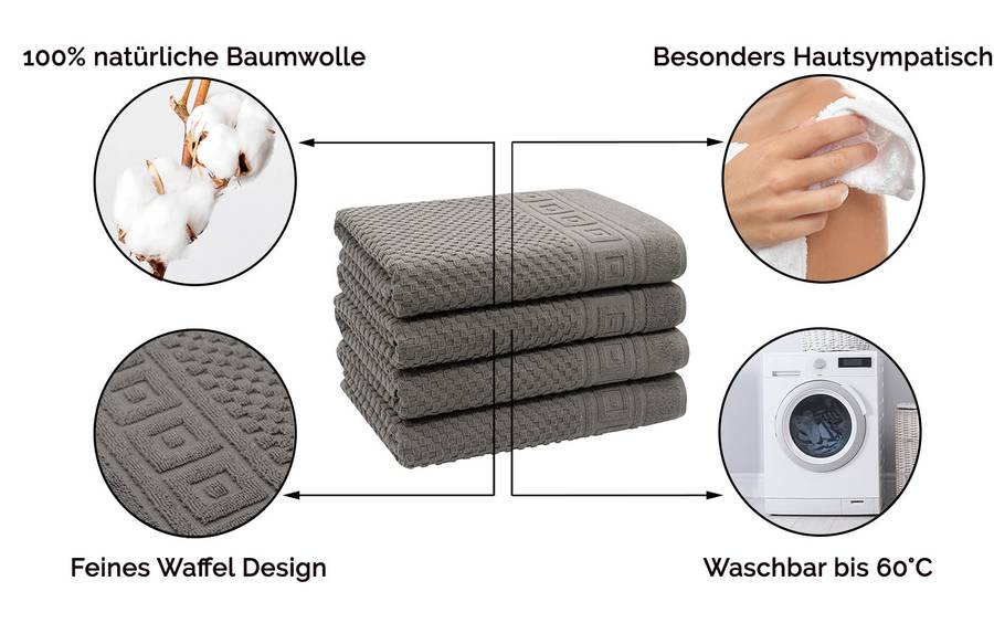 - Объем поставки: Комплект из 4 банных полотенец с вафельным узором