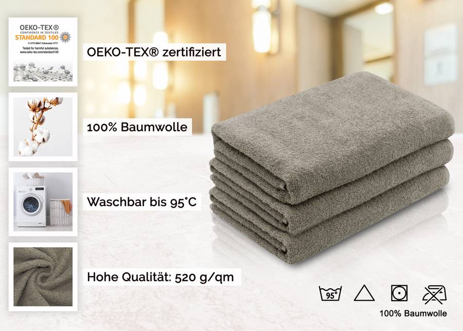 Большой комплект полотенец коричнево-серого цвета изготовлен из 100% хлопка, который был переработан в пушистую и хорошо впитывающую махровую ткань. Он невероятно приятен на ощупь. Плотность прочного банного полотенца составляет около 520 г/м², а длинные швы проклеены двойной защитной лентой. Также имеется вешалка для практичного хранения.