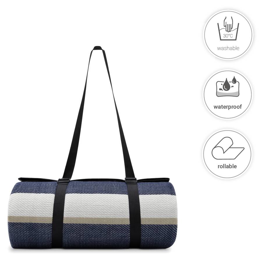 - ВНЕШНИЙ ВИД - Это модное одеяло для пикника, разработанное в модном скандинавском стиле, поставляется в сдержанных сине-желтых полосках.