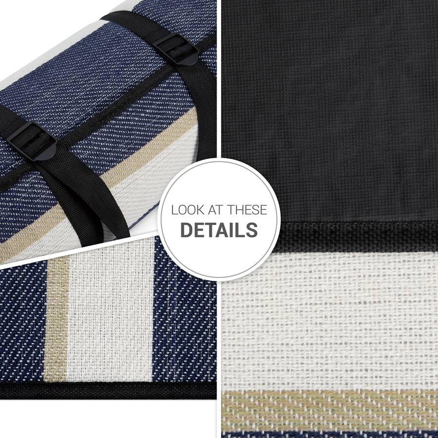 - ВНЕШНИЙ ВИД - Это модное одеяло для пикника, разработанное в модном скандинавском стиле, поставляется в сдержанных сине-желтых полосках.