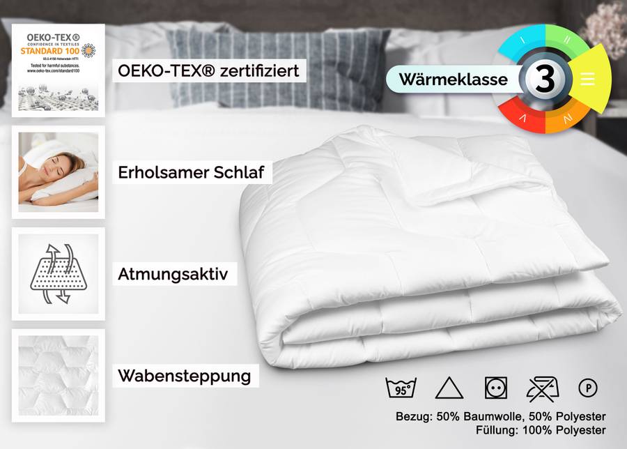 Идеально подходит для аллергиков, так как одеяло можно стирать при температуре до 95°C и сушить в сушильной машине. Вы можете выбрать подходящий вам размер из множества размеров.