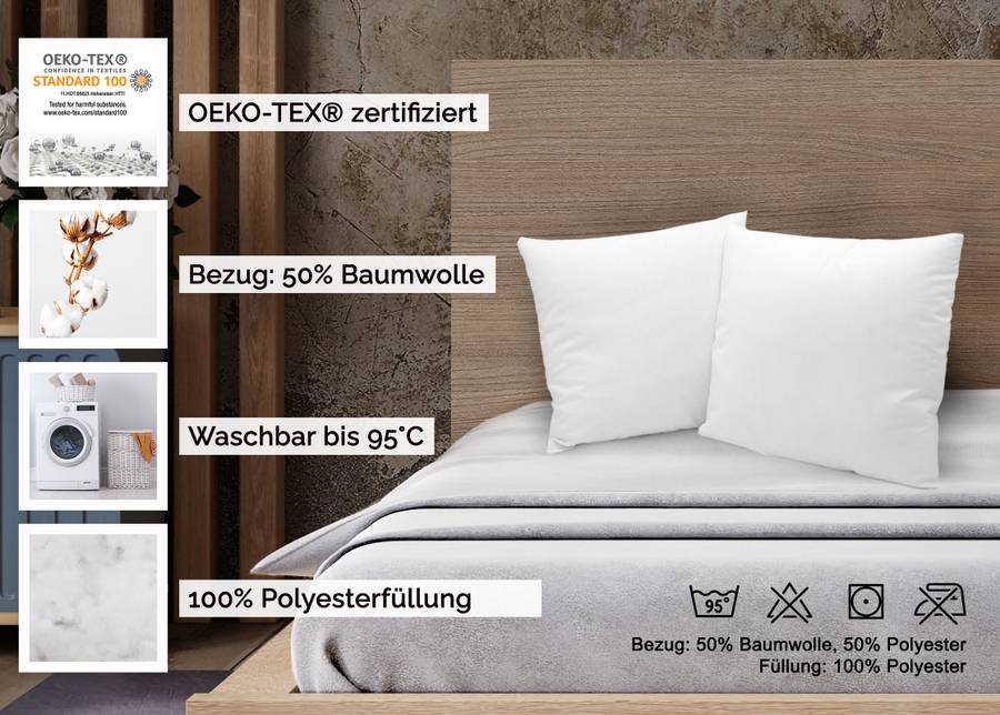 Дышащая подушка в практичном комплекте из двух доступна во многих размерах. Дышащая наволочка изготовлена из 50% хлопка и 50% полиэстера. Для индивидуального наполнения мягкий чехол оснащен застежкой-молнией и прошит ромбовидной стежкой. Только размеры 35x40 см и 40x40 см не имеют молнии и ромбовидной стежки. Полиэфирные волокна обеспечивают стабильность формы, не скатываясь. Подушки просты в уходе, их можно стирать при температуре 95°C и сушить в сушильной машине. Это означает, что даже люди, страдающие аллергией, смогут получить заслуженный отдых. После стирки дайте подушкам полностью высохнуть, чтобы защитить наполнитель от сваливания.
