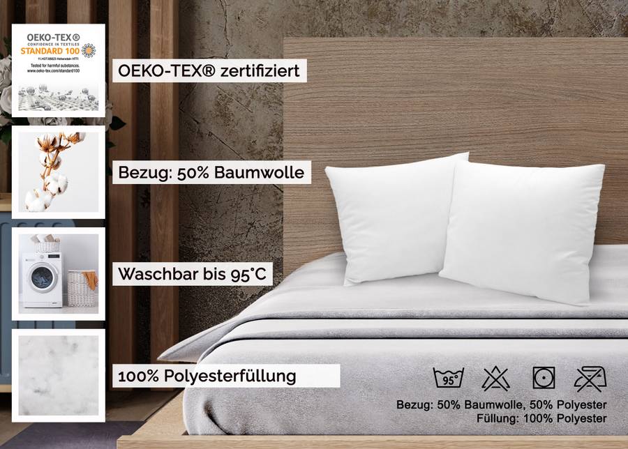 Дышащая подушка в практичном комплекте из двух доступна во многих размерах. Дышащая наволочка изготовлена из 50% хлопка и 50% полиэстера. Для индивидуального наполнения мягкий чехол оснащен застежкой-молнией и прошит ромбовидной стежкой. Только размеры 35x40 см и 40x40 см не имеют молнии и ромбовидной стежки. Полиэфирные волокна обеспечивают стабильность формы, не скатываясь. Подушки просты в уходе, их можно стирать при температуре 95°C и сушить в сушильной машине. Это означает, что даже люди, страдающие аллергией, смогут получить заслуженный отдых. После стирки дайте подушкам полностью высохнуть, чтобы защитить наполнитель от сваливания.