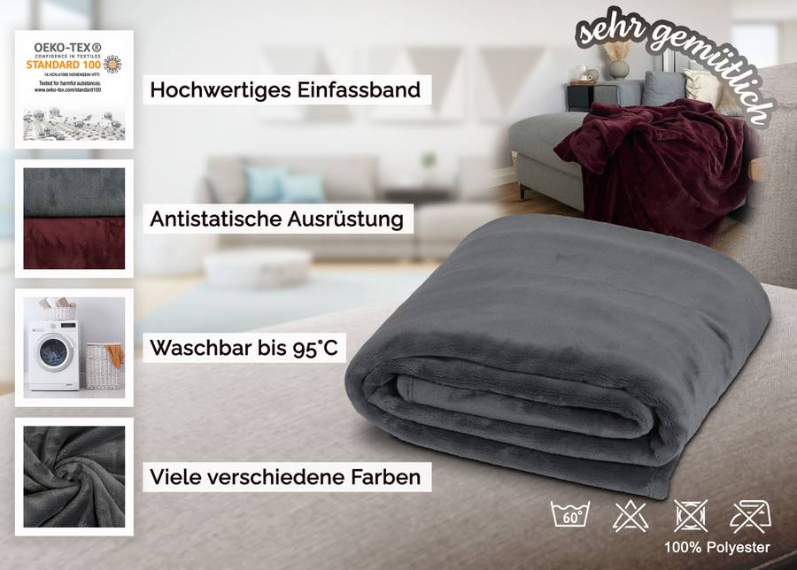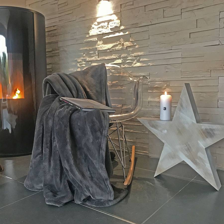 Изготовлено из 100% полиэстера плотностью 450 г/м², оно особенно теплое и нежное. Благодаря размеру 220 x 240 см и темно-серому цвету, плед впишется в любой интерьер и будет приглашать вас закутаться в него, даже если вы с партнером.