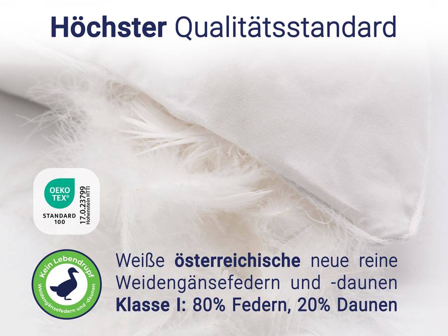 Пушистый, мягкий наполнитель состоит из чистых белых перьев и пуха австрийских гусей пастбищного откорма I класса и очень дышащий, что снижает потоотделение по ночам. Благодаря высокому содержанию пера (80%) подушка не сминается ночью и обеспечивает комфортную поддержку. Чтобы предотвратить прокалывание игл, мягкий чехол с окантовкой изготовлен из плотно сотканного 100% хлопкового твила. Эта высококачественная подушка произведена в Германии с использованием климатически нейтрального процесса и поставляется в практичном мешочке для хранения.