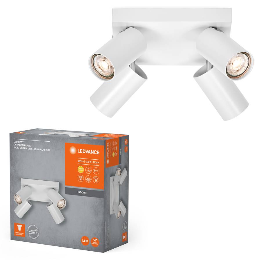 - Комплект поставки: 1x Светодиодный точечный светильник Octagon GU10 White Plate 4x3.4W 927 DIM