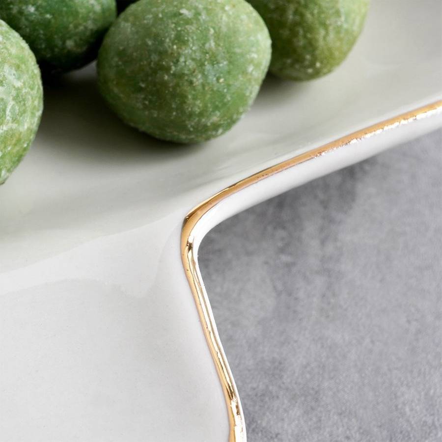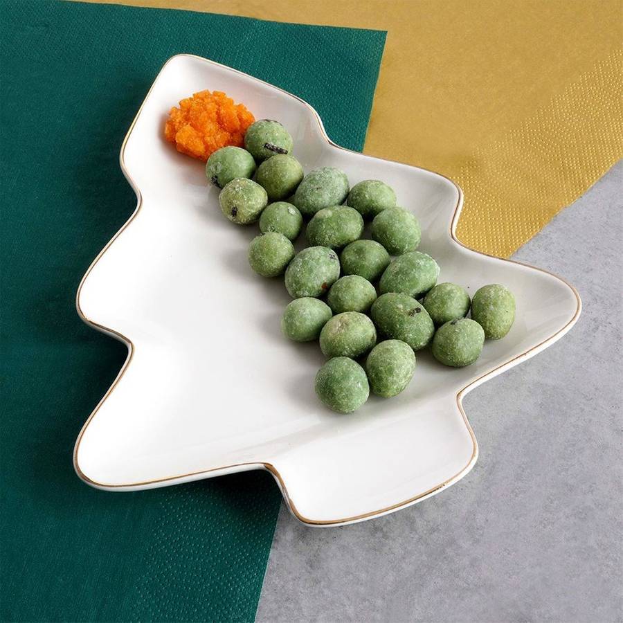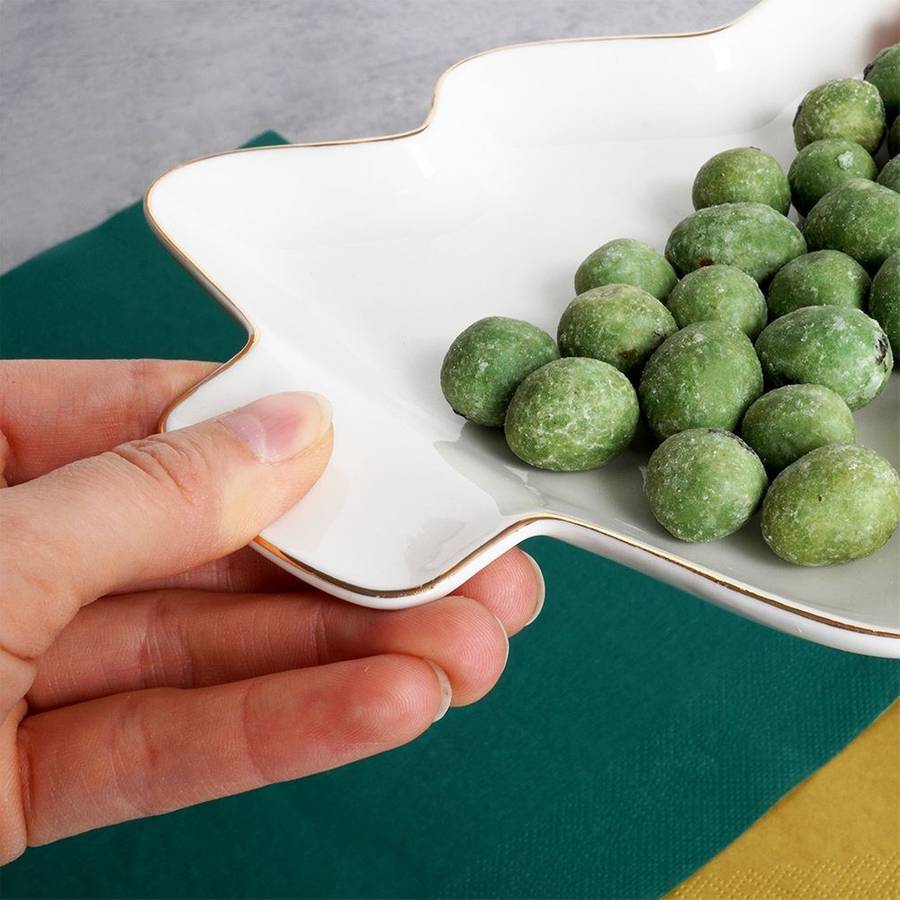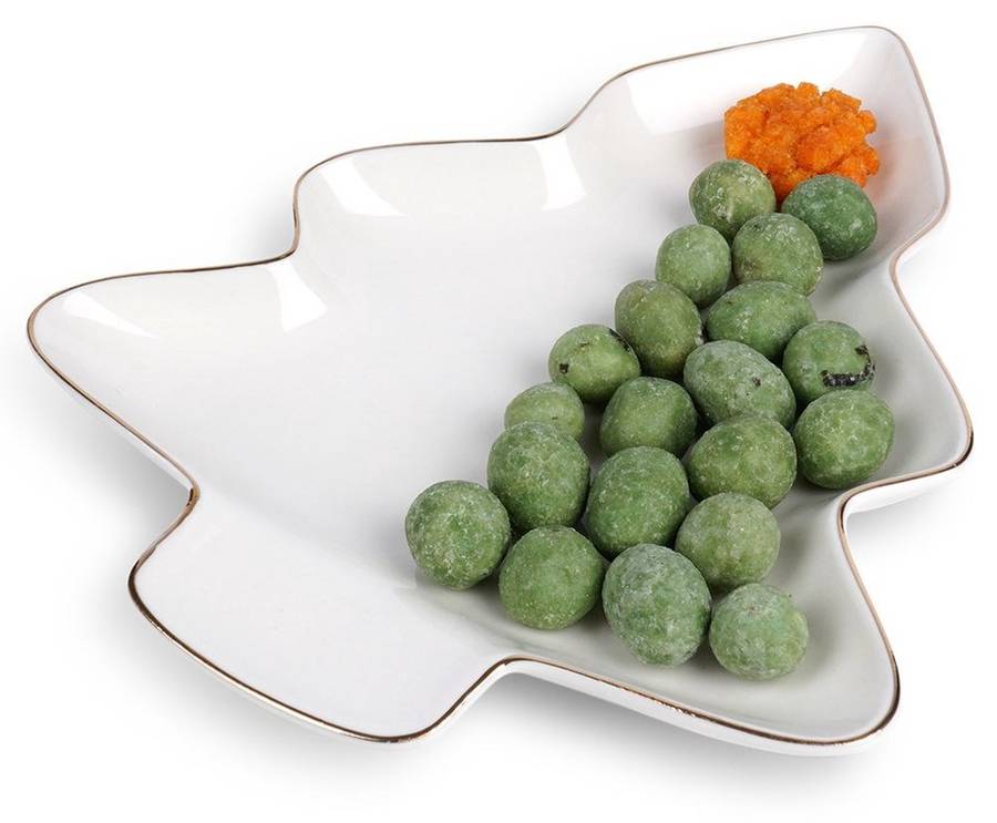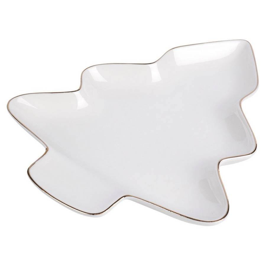 Декоративная тарелка в форме рождественской елки размером 20 х 16,5 х 2 см. Очень стильная, также будет красиво смотреться на столе в канун Рождества. Изготовлена из белого фарфора с золотым декором по краю. Изготовлено в соответствии с европейскими стандартами.