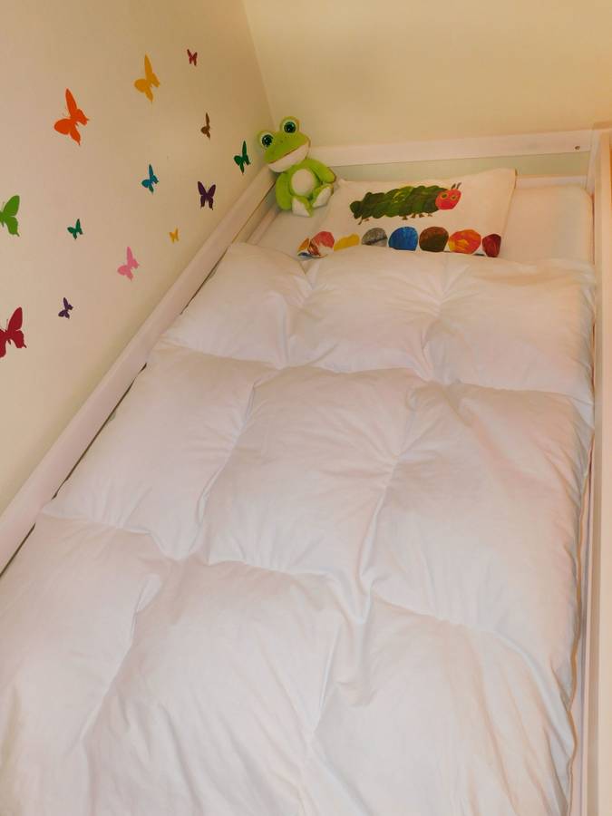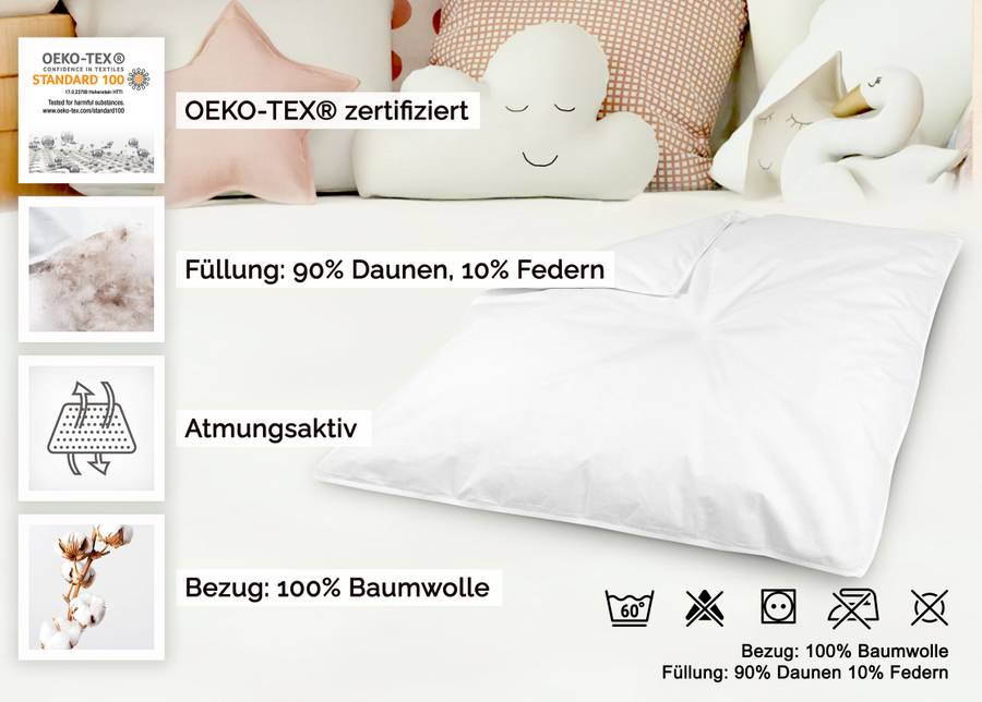 Это детское одеяло наполнено на 90% пухом и на 10% пером. Используются только новые, отборные пух и перья, которые НЕ выщипываются вживую. Чехол изготовлен из 100% хлопка, непроницаемого для пера и пуха. Это предотвращает провисание пуха и перьев. Выберите один из двух размеров, чтобы найти подходящий для вашего ребенка.