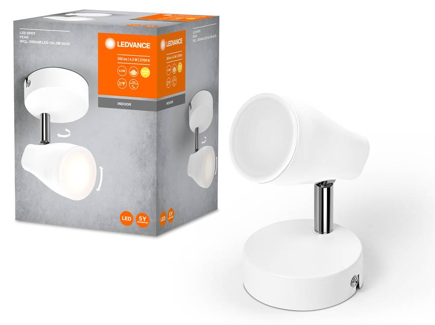 - Область применения Комплект поставки: 1xLED SPOT PEAR 1X4.3W 827 GU10 WT