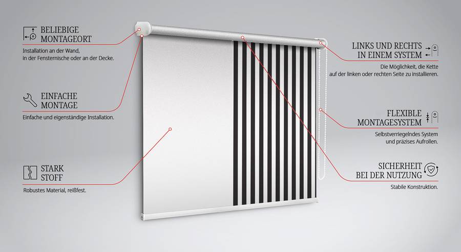 • Примечание по размерам:Общая ширина жалюзи - это ширина ткани + 5 см (труба 1 см + система крепления 4 см)