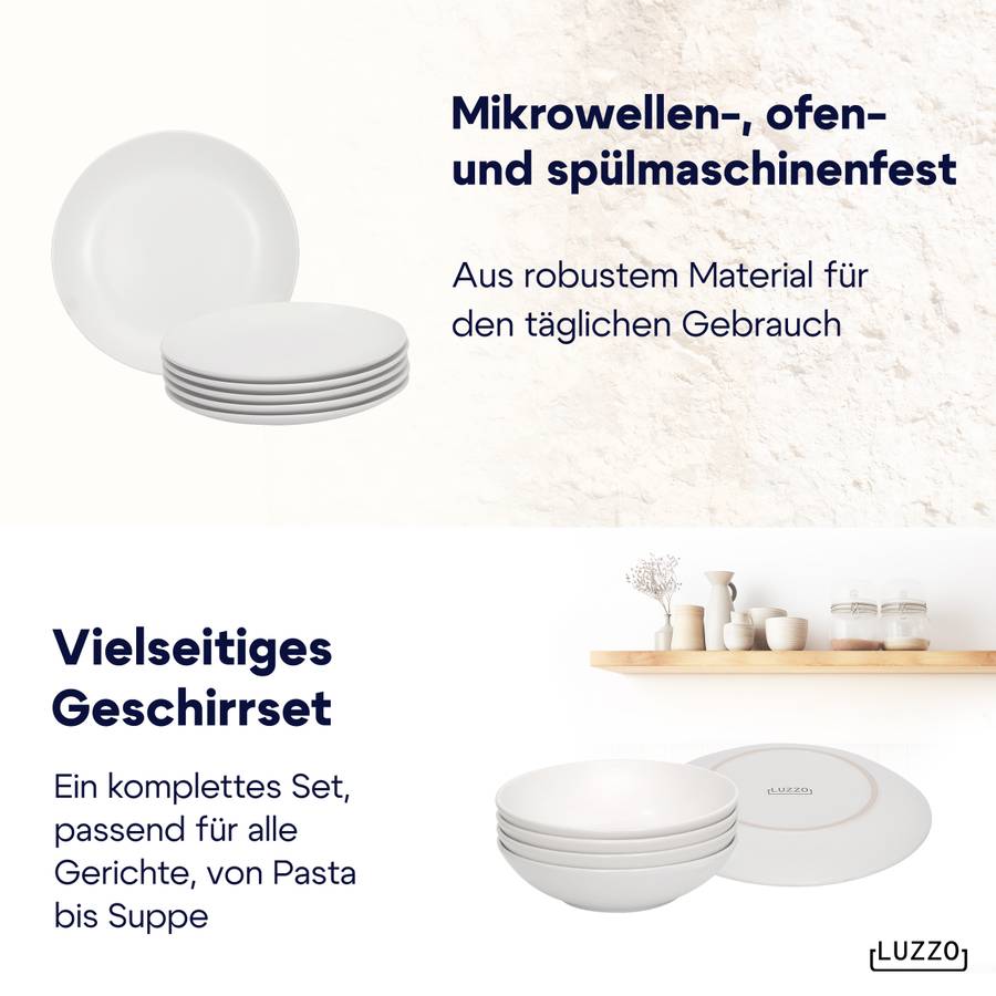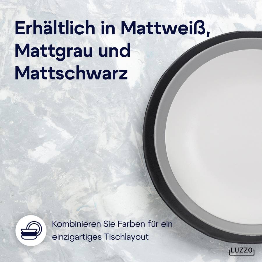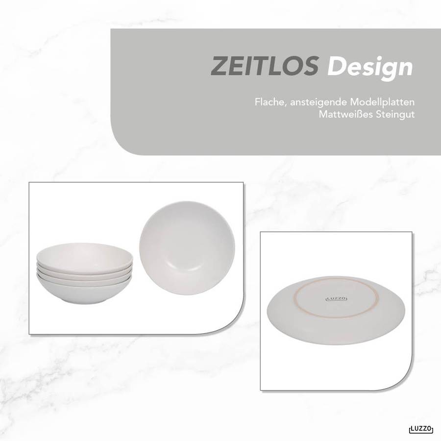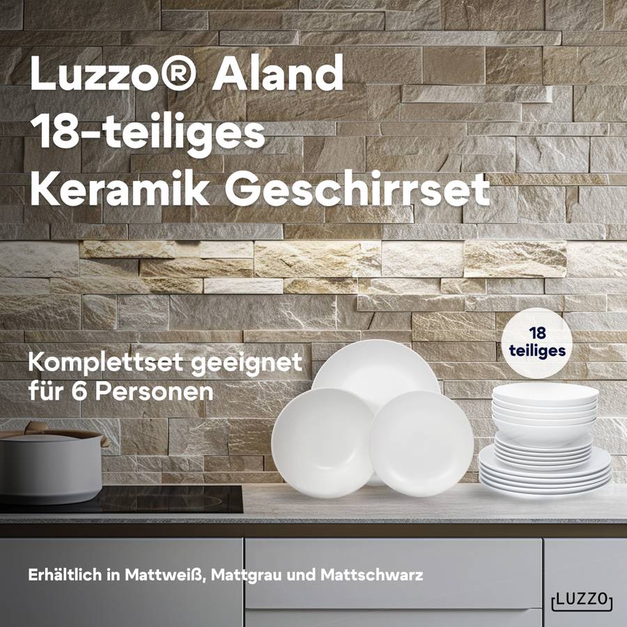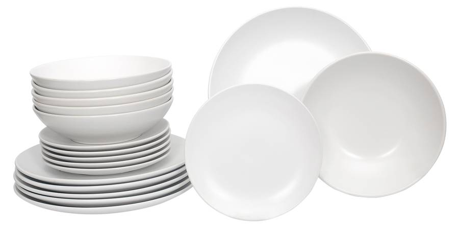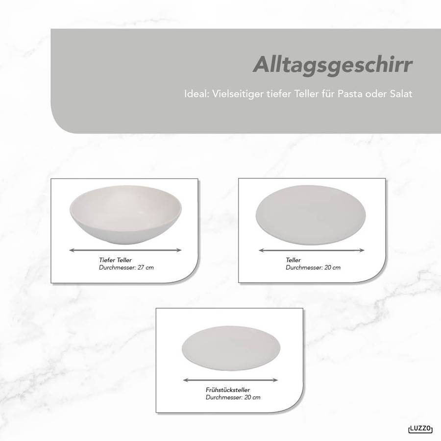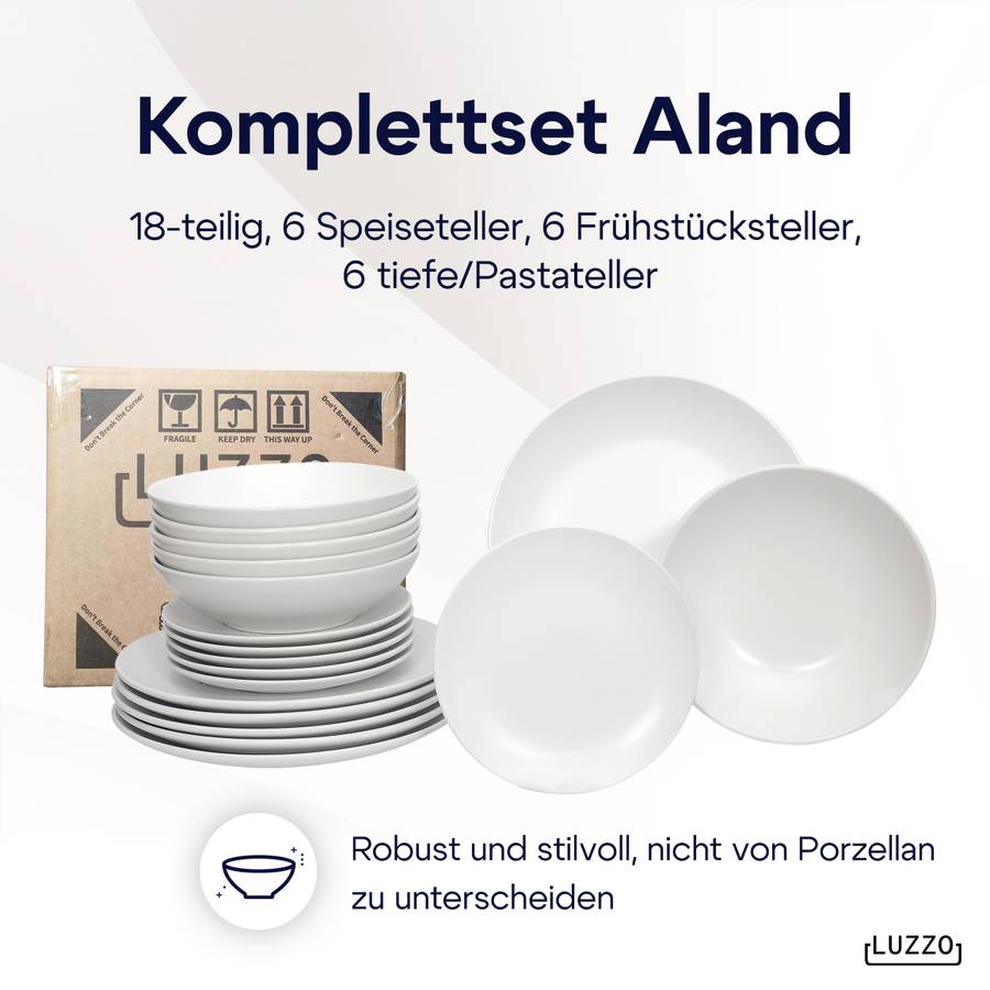 Серия Luzzo Aland отличается простым и вневременным дизайном. Эта посуда изготовлена из белого керамогранита. Набор состоит из 18 предметов, по 6 каждого типа (обеденная тарелка, тарелка для завтрака и глубокая тарелка для пасты). Благодаря глубокой тарелке этот набор становится еще более универсальным. Вы можете использовать его для пасты, супа, йогурта с фруктами или салата.