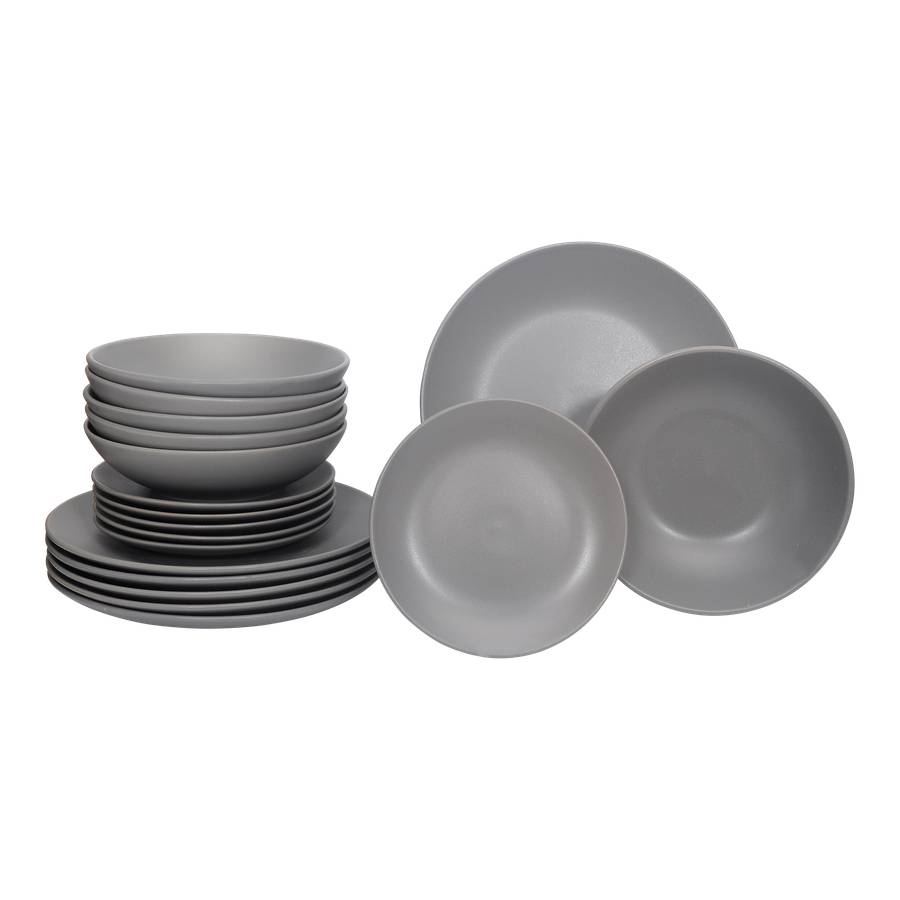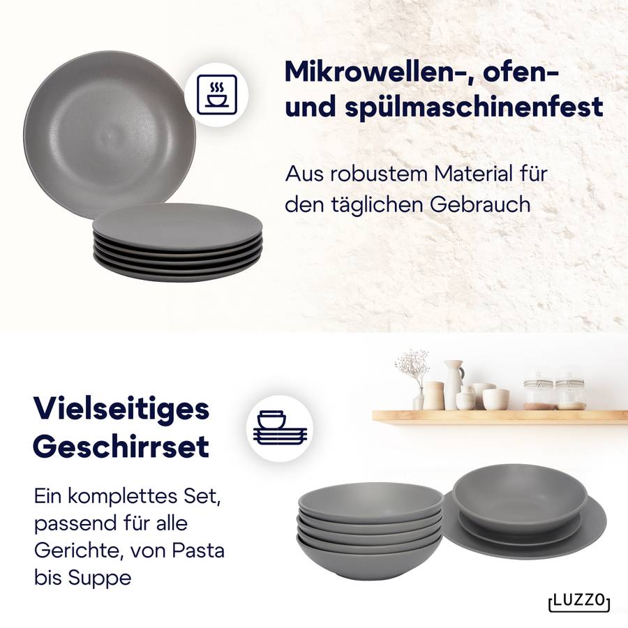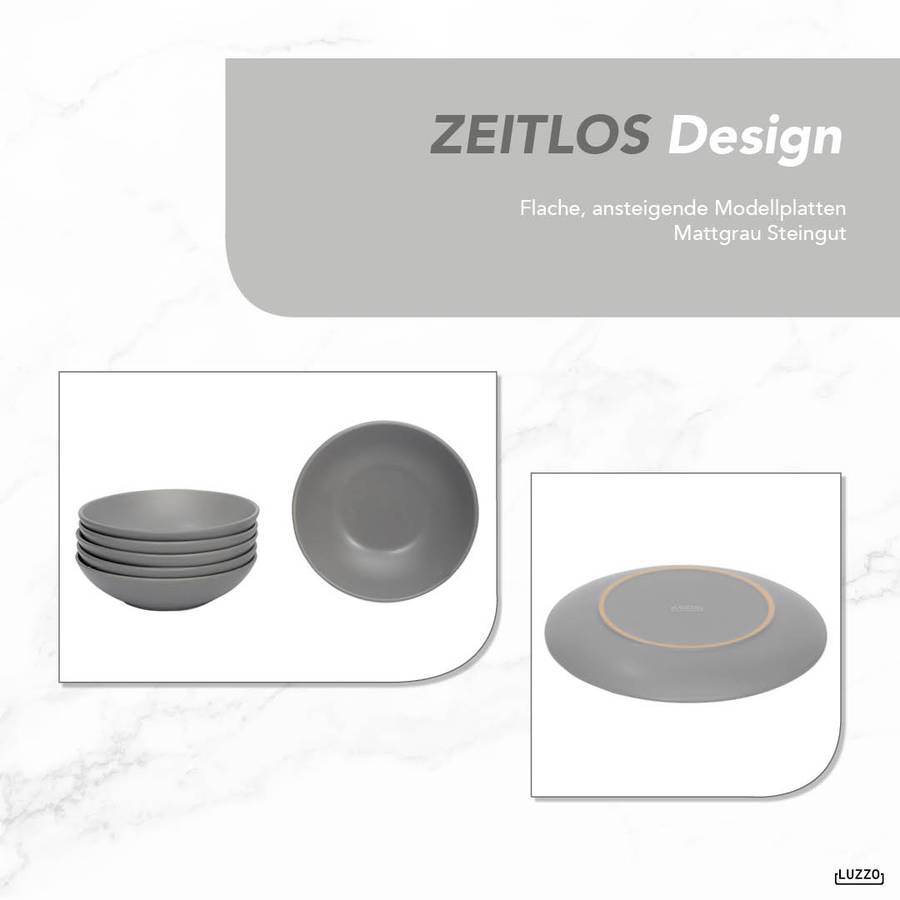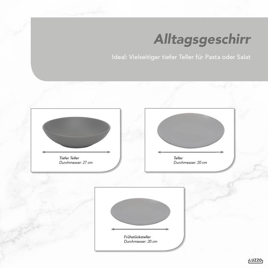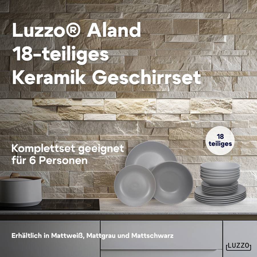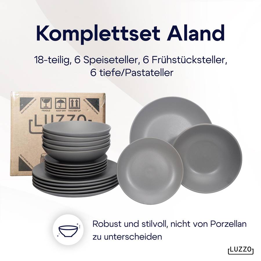 Серия Luzzo Aland отличается простым и вневременным дизайном. Эта посуда изготовлена из матово-серого керамогранита. Набор состоит из 18 предметов, по 6 каждого типа (обеденная тарелка, тарелка для завтрака и глубокая тарелка для пасты). Благодаря глубокой тарелке этот набор становится по-настоящему универсальным. Вы можете использовать его для пасты, супа, йогурта с фруктами или салата.