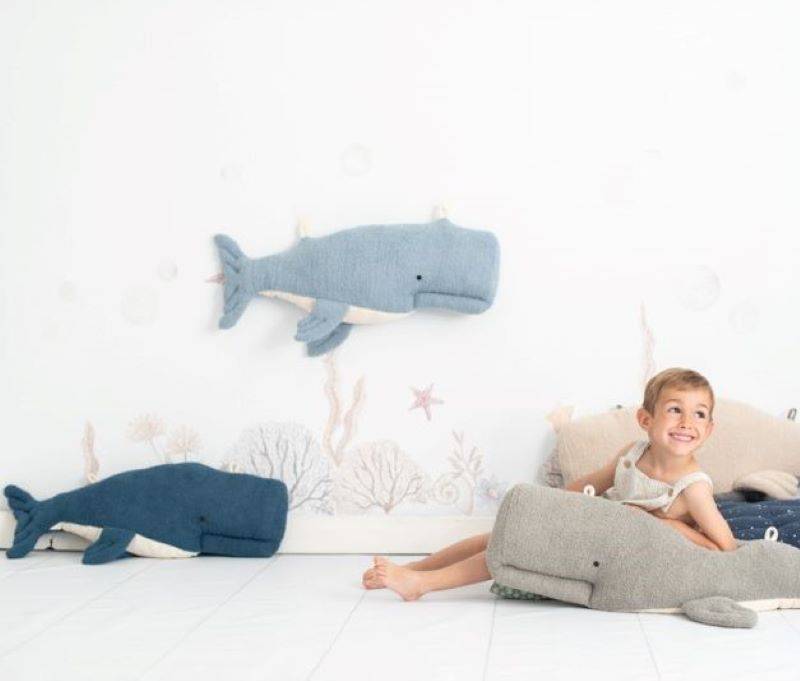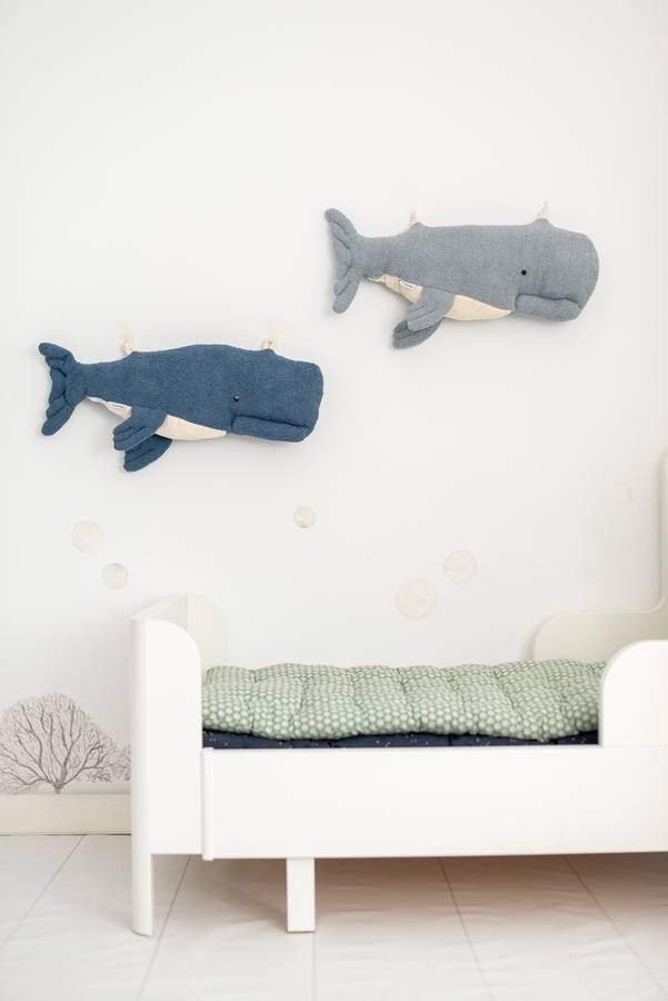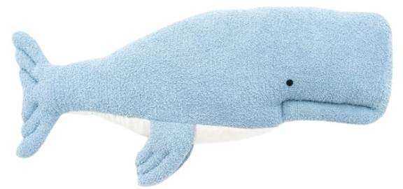 Наша светло-голубая белуга сделана из мягкой махровой ткани, а нижняя часть - из бархата. Внутри - небольшой колокольчик, а сверху - две аппликации из той же ткани, что позволяет повесить ее на стену детской комнаты. Его также можно использовать для украшения кровати, в качестве декоративной подушки или как мягкую плюшевую игрушку.