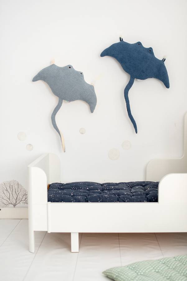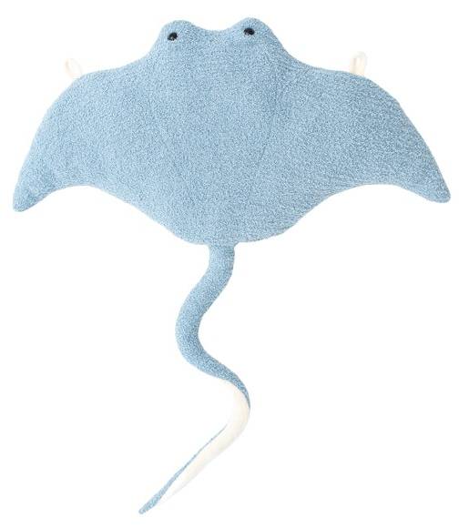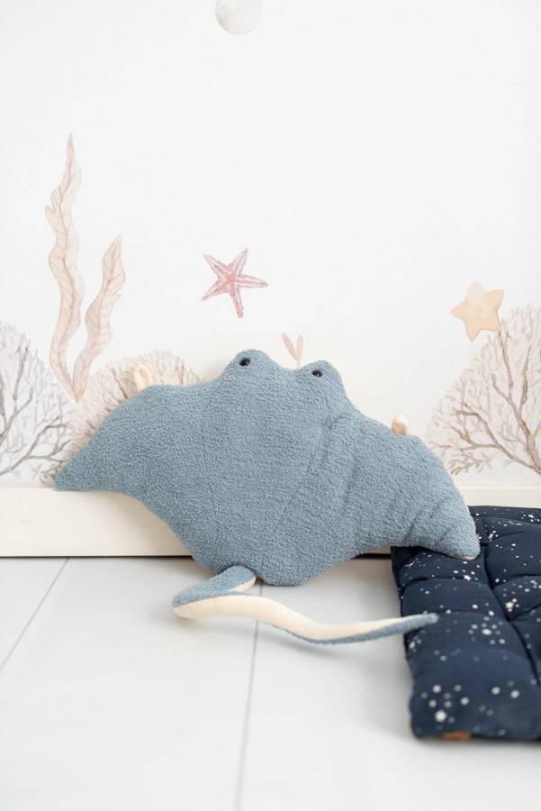 Наш светло-голубой скат манта спереди выполнен из мягкой махровой ткани, а сзади - из бархата. Внутри тела у него есть колокольчик, а сзади - две аппликации из той же ткани, что позволяет повесить его на стену для украшения детской комнаты. Его также можно использовать как подушечку для украшения кровати или как мягкую плюшевую игрушку. Он имеет забавный дизайн в форме рыбы с большими плавниками.