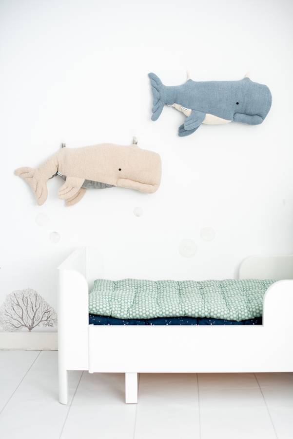 Наш игровой и декоративный набор кукол состоит из двух очаровательных белух бежевого и светло-голубого цветов. В комплект входит небольшой колокольчик с нежным звоном, а также две аппликации из той же ткани, которые можно легко повесить на стену. Уникальный декоративный настенный игровой элемент, где морской мир станет прекрасным акцентом в детской комнате. Наши забавные Белуги также могут служить оригинальными подушками для кровати.