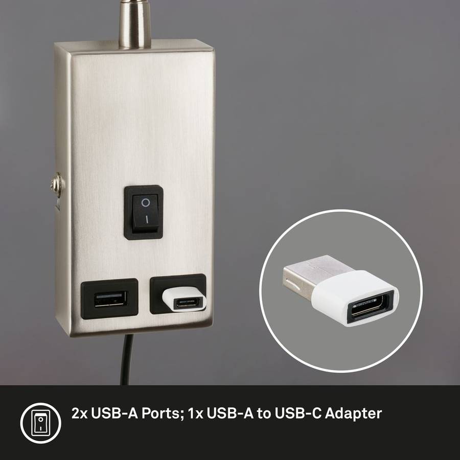 Универсальное освещение Этот светильник для спальни оснащен цоколем GU10 для лампочек мощностью до 10 Вт (лампочки не входят в комплект). Это обеспечивает гибкие варианты освещения и возможность индивидуальной регулировки положения света. Практичная гибкость Благодаря гибкому рычагу длиной 50 см настенный светильник обеспечивает точное направление света, идеально подходит для рабочих зон, уголков для чтения или в качестве прикроватного светильника. Современные варианты подключения В комплект входят 2 порта USB 5 В 4,5 Вт и адаптер USB-A - USB-C, который идеально подходит для зарядки смартфонов, планшетов и других устройств. Компактный и элегантный дизайн При высоте 485 мм, ширине 60 мм и длине 425 мм этот светильник сочетает в себе функциональность со стильным матовым никелированным покрытием. Простота эксплуатации Встроенный переключатель ВКЛ / ВЫКЛ делает эксплуатацию настенного светильника простой, а длинный соединительный кабель 0,5 м и компактный размер основания 115 x 60 мм (В x Ш) обеспечивают гибкое размещение.