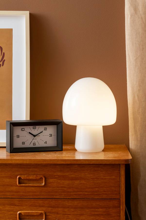 Эта стеклянная настольная лампа в форме гриба создаст в вашем доме теплую атмосферу. Ее округлые очертания и глянцевая поверхность создают мягкий, атмосферный свет. Стильный акцент для любой комнаты, идеально подходящий для тех, кто ценит сдержанный дизайн с характером.