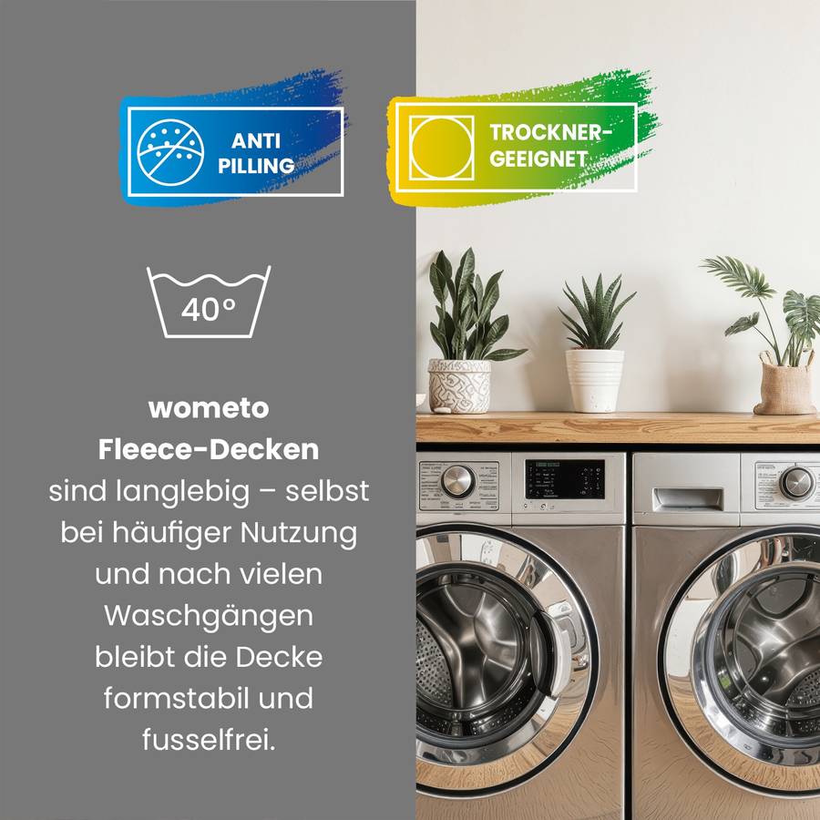 Флисовые одеяла Wometo долговечны - даже при частом использовании и после множества стирок одеяло сохраняет стабильность размеров и не оставляет ворса (антипиллинг). Одеяло с модным обрезанным краем в виде волны.