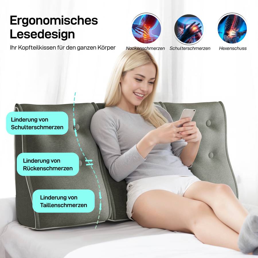 Эта льняная клиновидная подушка идеально подходит для чтения в постели. Разработанная экспертами и тщательно протестированная в соответствии с вашими потребностями, она идеально адаптируется к контурам вашей спины. Она обеспечивает оптимальную поддержку спины и поясницы, позволяя вам расслабиться во время чтения, просмотра телевизора или работы с ноутбуком. Она также снижает давление при длительном сидении, обеспечивая больший комфорт. Она также имеет боковые карманы для мелких предметов, таких как телефон или пульт от телевизора.