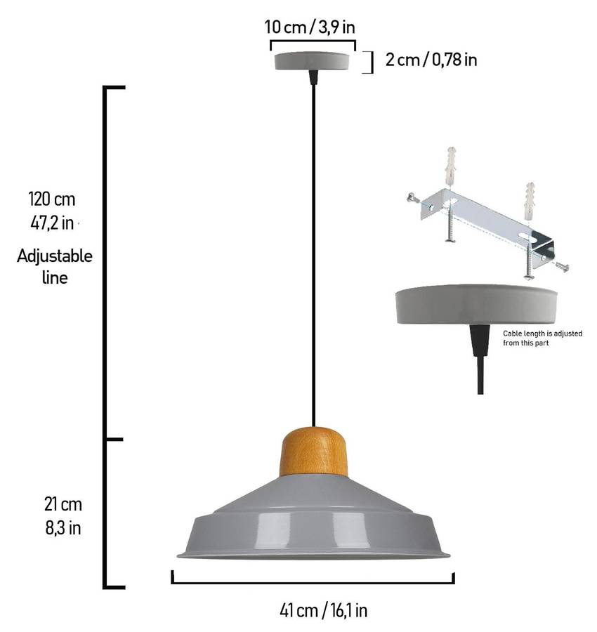 ТЕХНИЧЕСКАЯ ИНФОРМАЦИЯ И ВЫСОКОКАЧЕСТВЕННЫЕ МАТЕРИАЛЫ: Деревянный подвесной светильник изготовлен из металла (размер: как на рисунке), цоколь: E27. Можно использовать светодиодные, галогенные и обычные лампочки мощностью до 60 Вт. Лампочка в комплект не входит. Напряжение: 120-240 В. Можно использовать с диммером. РАЗМЕРЫ И РЕГУЛИРУЕМАЯ ВЫСОТА: высота 28 см, диаметр 41 см. Диаметр круглого потолочного крепления - 10 см. В комплект входит прочный регулируемый по длине кабель длиной 120 см. Длину кабеля можно регулировать в соответствии с вашими предпочтениями и дизайном, и можно подвешивать выше или ниже по желанию.