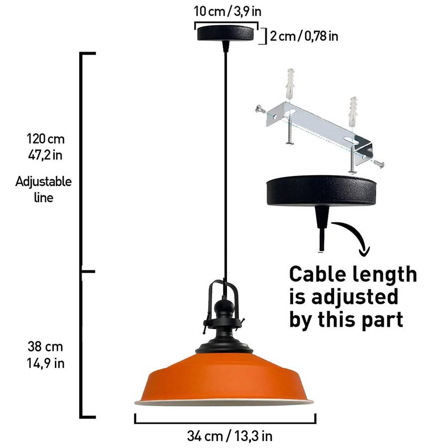ТЕХНИЧЕСКАЯ ИНФОРМАЦИЯ И ВЫСОКОКАЧЕСТВЕННЫЕ МАТЕРИАЛЫ: Подвесной светильник изготовлен из металла (размер: как на рисунке), цоколь: E27. Можно использовать светодиодные, галогенные и обычные лампочки мощностью до 60 Вт. Лампочка в комплект не входит. Напряжение: 120-240 В. Можно использовать с диммером. РАЗМЕРЫ И РЕГУЛИРУЕМАЯ ВЫСОТА: высота 28 см, диаметр 40 см. Диаметр круглого потолочного крепления - 10 см. В комплект входит прочный регулируемый по длине кабель длиной 120 см. Длину кабеля можно регулировать в соответствии с вашими предпочтениями и дизайном, и можно подвешивать выше или ниже по желанию.