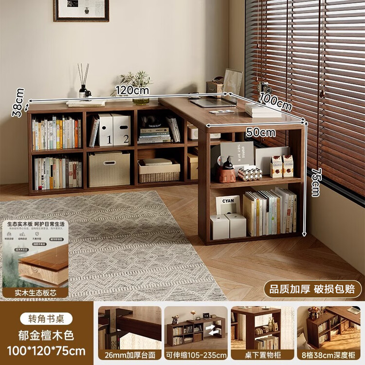 Угловой стол Naijia из массива дерева, идеально подходит для учебы и работы. Размер 100x120 см, цвет Tanmu, с удобными полками.