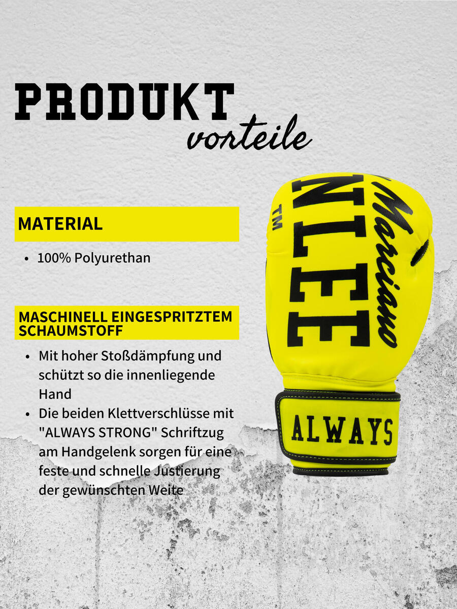 Хотите не только быть в отличной экипировке на тренировке, но и выделяться? Тогда перчатки CHUNKY B ярких неоновых цветов — это то, что вам нужно. Наполнитель изготовлен из пены машинного формования с высокой амортизацией, что защищает внутреннюю часть ладони. Две застёжки-липучки с надписью ALWAYS STRONG на запястье обеспечивают надёжную и быструю регулировку по ширине. И наконец, изюминка: когда две перчатки сложены вместе, получается полноценный логотип BENLEE.