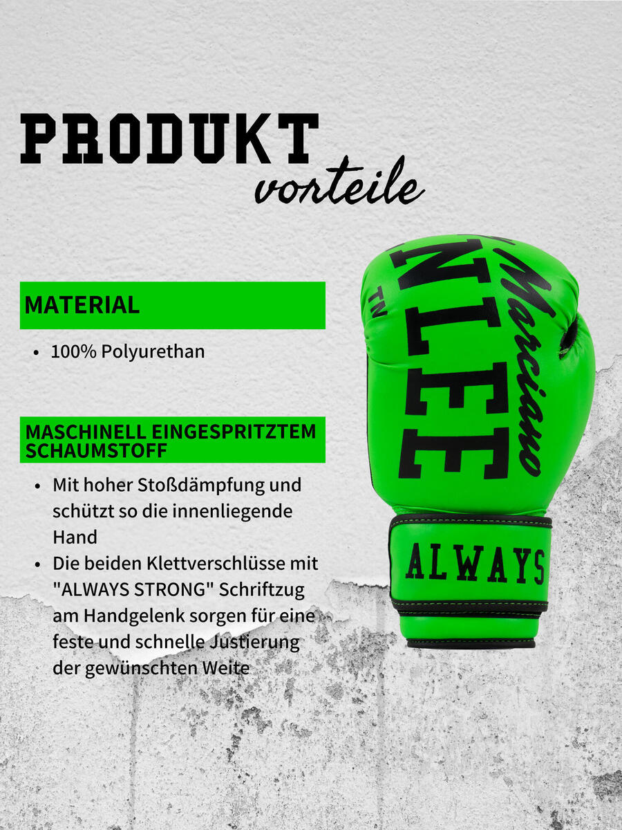 Хотите не только быть в отличной экипировке на тренировке, но и выделяться? Тогда перчатки CHUNKY B ярких неоновых цветов — это то, что вам нужно. Наполнитель изготовлен из пены машинного формования с высокой амортизацией, что защищает внутреннюю часть ладони. Две застёжки-липучки с надписью ALWAYS STRONG на запястье обеспечивают надёжную и быструю регулировку по ширине. И наконец, изюминка: когда две перчатки сложены вместе, получается полноценный логотип BENLEE.
