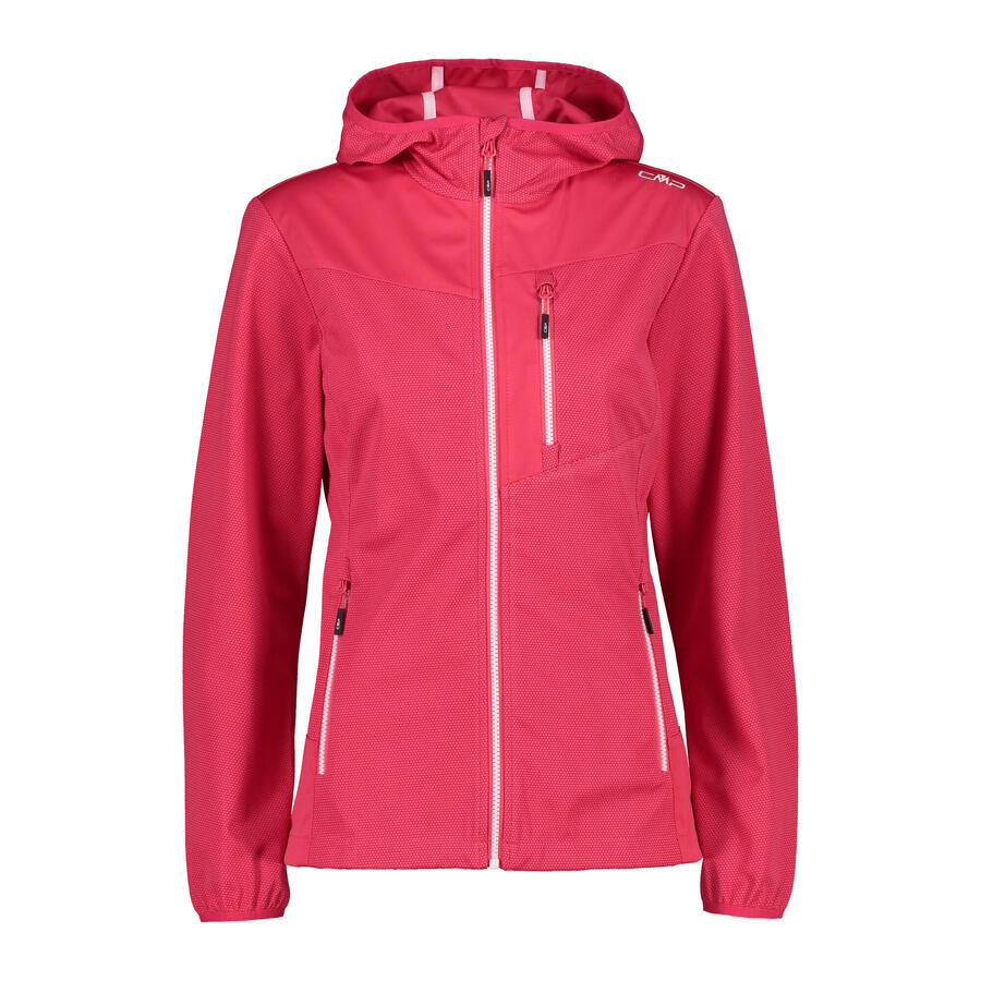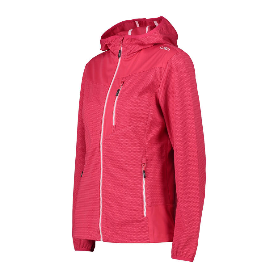 Женская куртка софтшелл CMP WOMAN JACKET FIX HOOD. Ветро- и водонепроницаемая куртка софтшелл с несъемным капюшоном. Высокий воротник с защитой подбородка. WP 5000. MVP 5000. Материал: 100% полиэстер.