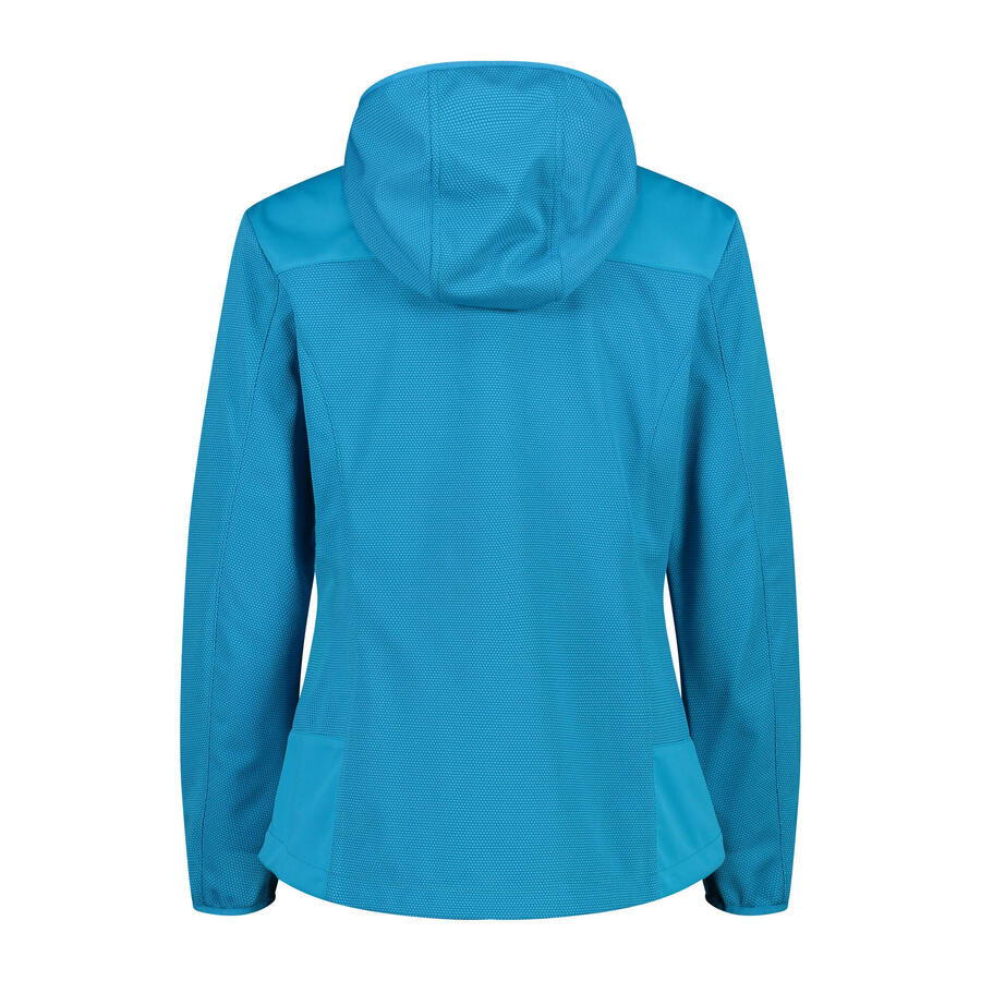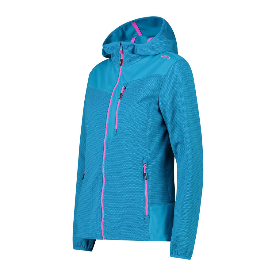 Женская куртка софтшелл CMP WOMAN JACKET FIX HOOD. Ветро- и водонепроницаемая куртка софтшелл с несъемным капюшоном. Высокий воротник с защитой подбородка. WP 5000. MVP 5000. Материал: 100% полиэстер.