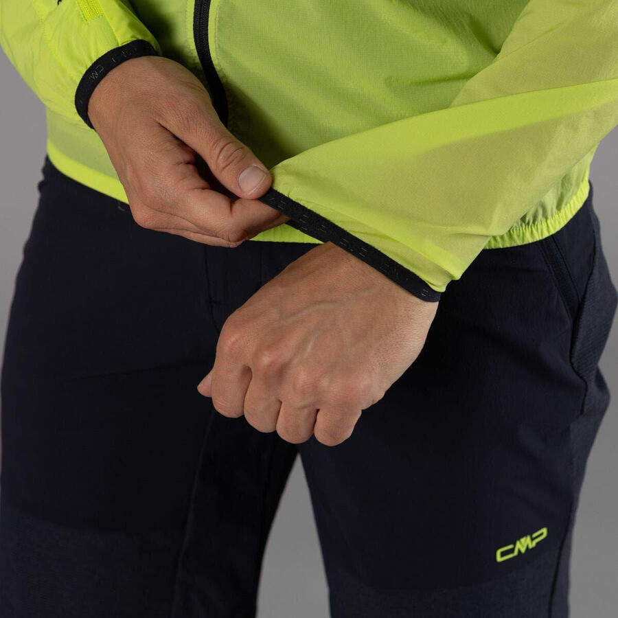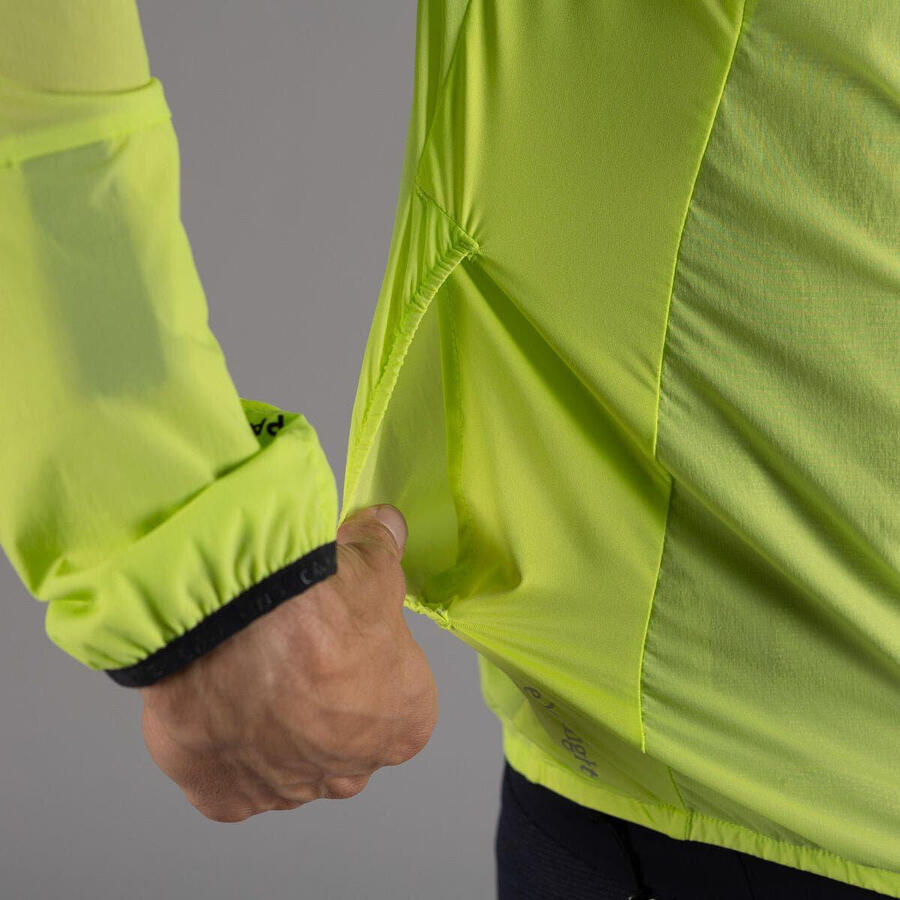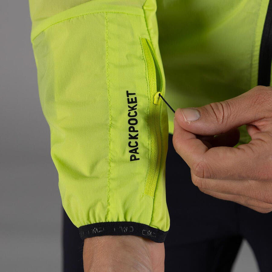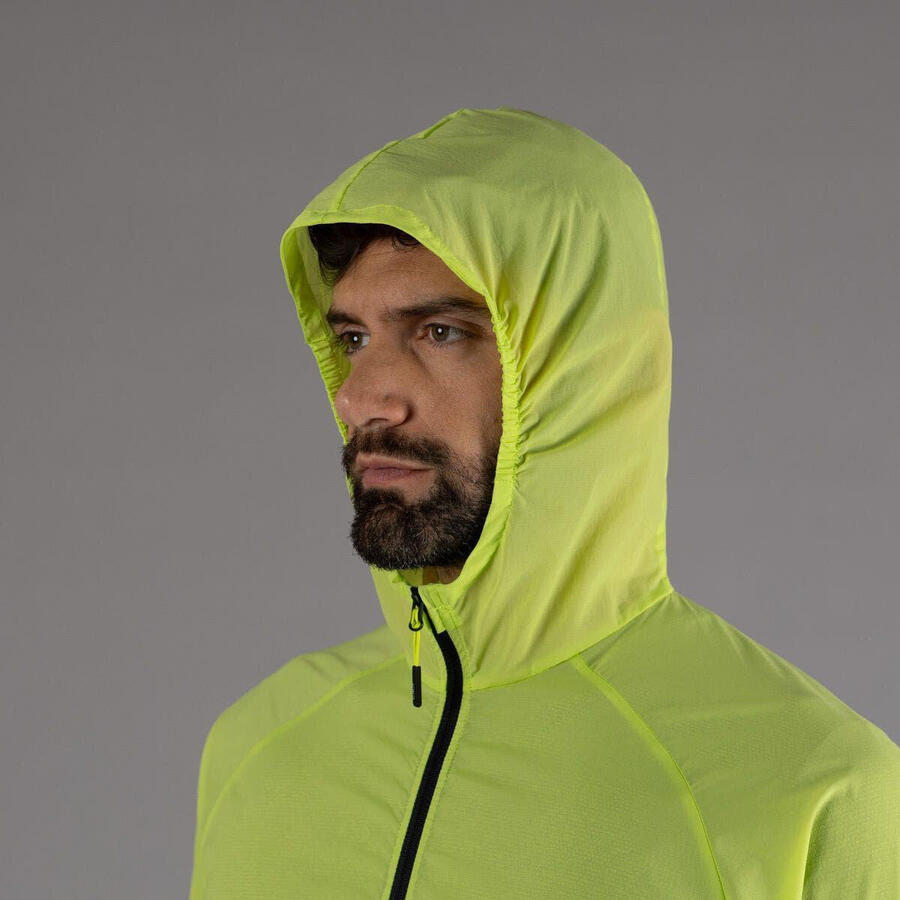 Мужская беговая куртка из сверхлегкого материала – тонкого, лёгкого и прочного, который легко помещается в карман на груди слева и надевается в небольшой дождь или ветер.