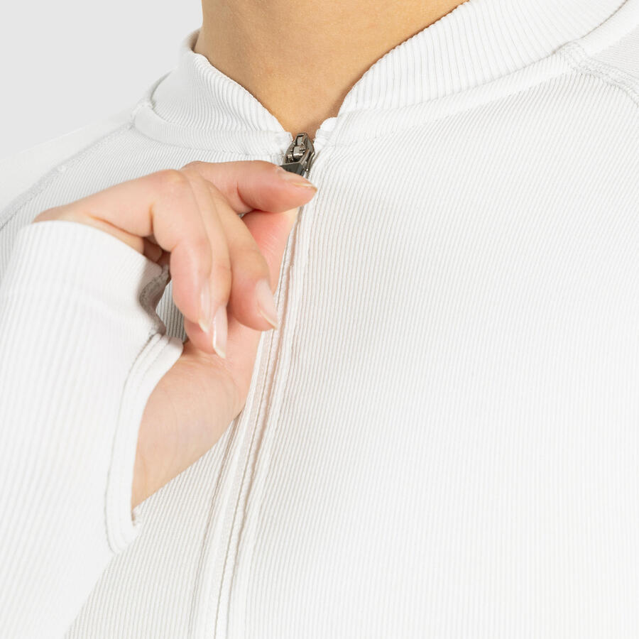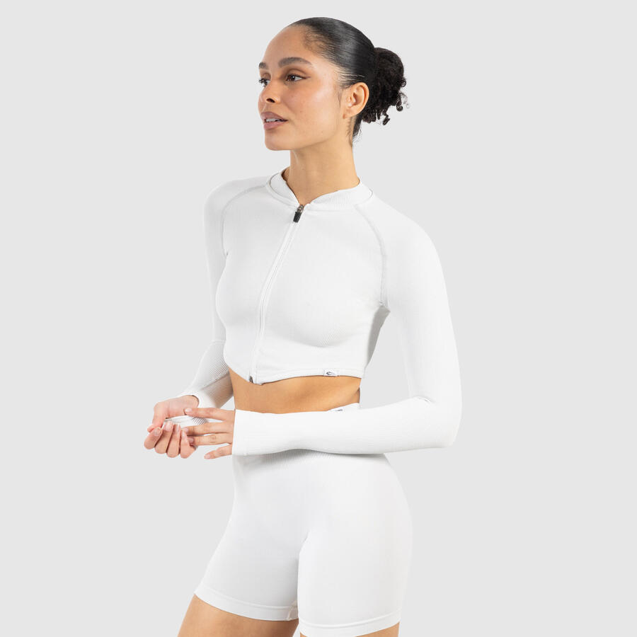 Наша укороченная куртка впечатляет спортивным стилем и функциональным комфортом. Бесшовный материал приятен на ощупь и обеспечивает полную свободу движений. Укороченный крой подчеркивает талию, а воротник-стойка и молния создают лаконичный образ. Отверстия для больших пальцев на рукавах обеспечивают надежную фиксацию — идеально для разминки, спортивных нарядов или современных многослойных образов.