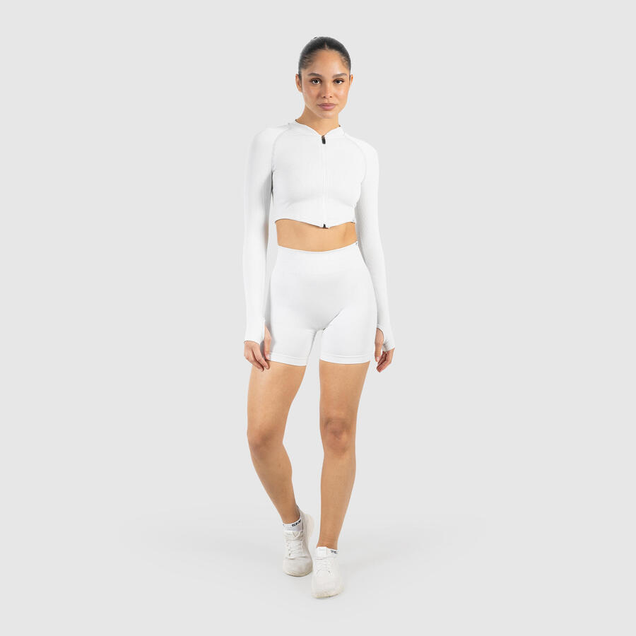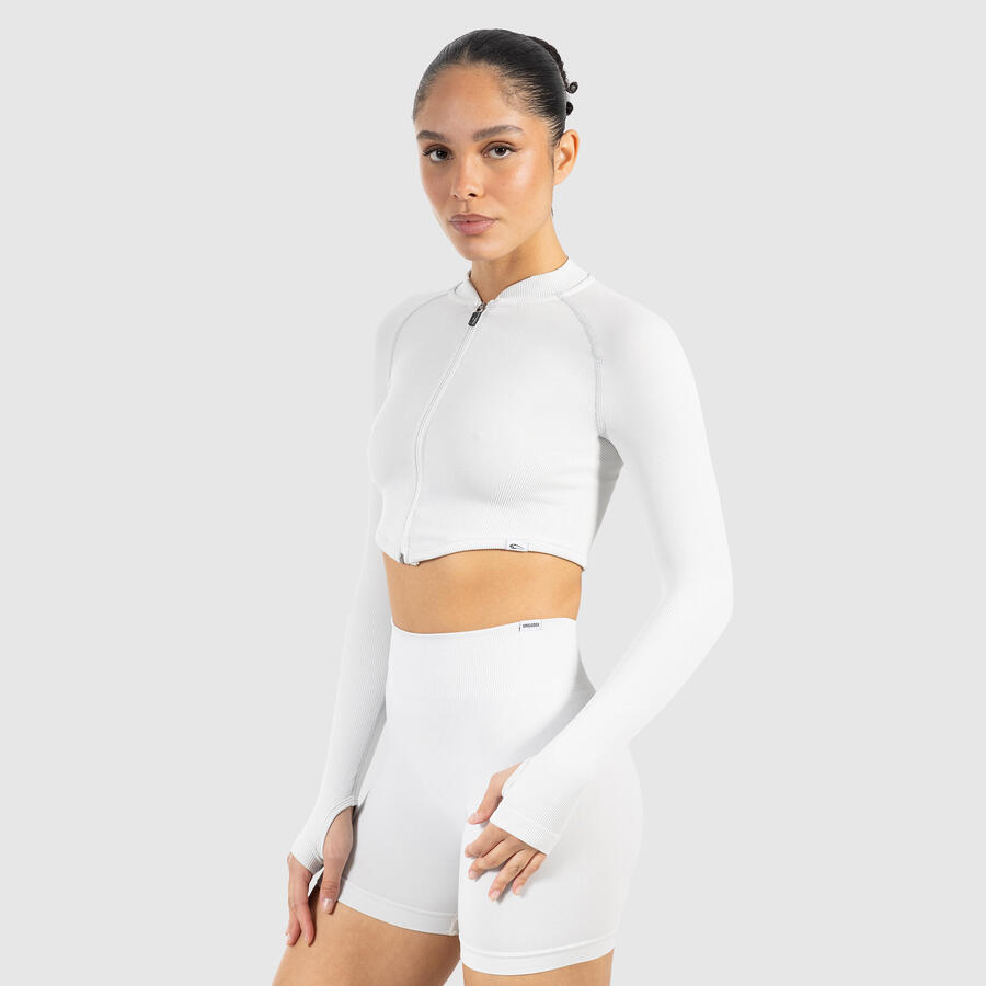 Наша укороченная куртка впечатляет спортивным стилем и функциональным комфортом. Бесшовный материал приятен на ощупь и обеспечивает полную свободу движений. Укороченный крой подчеркивает талию, а воротник-стойка и молния создают лаконичный образ. Отверстия для больших пальцев на рукавах обеспечивают надежную фиксацию — идеально для разминки, спортивных нарядов или современных многослойных образов.