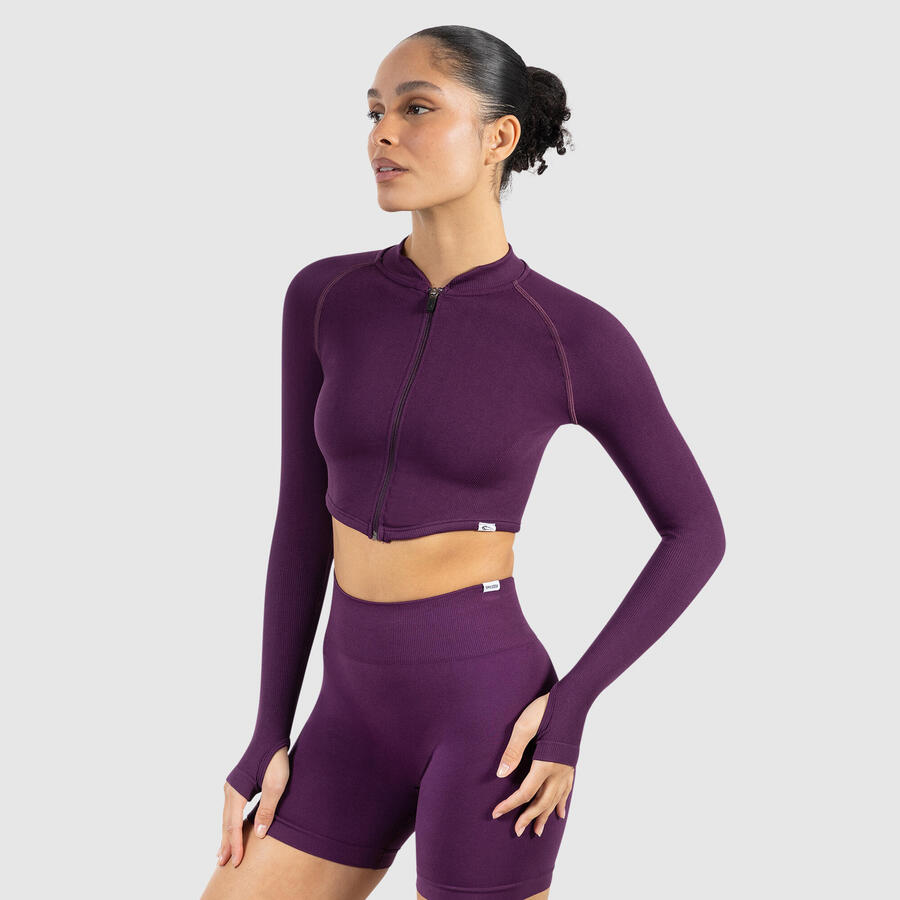 Наша укороченная куртка впечатляет спортивным стилем и функциональным комфортом. Бесшовный материал приятен на ощупь и обеспечивает полную свободу движений. Укороченный крой подчеркивает талию, а воротник-стойка и молния создают лаконичный образ. Отверстия для больших пальцев на рукавах обеспечивают надежную фиксацию — идеально для разминки, спортивных нарядов или современных многослойных образов.