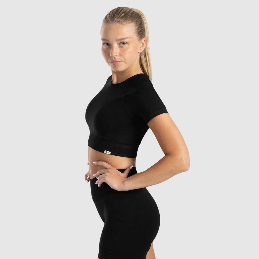 Этот женский укороченный топ сочетает в себе облегающий крой и классический круглый вырез. Широкий пояс с тонкими ребристыми вставками обеспечивает идеальную посадку, а материал приятен на ощупь. Короткие рукава и простой крой делают этот топ универсальным базовым предметом гардероба — он подойдёт для занятий в студии, тренировок или на каждый день.