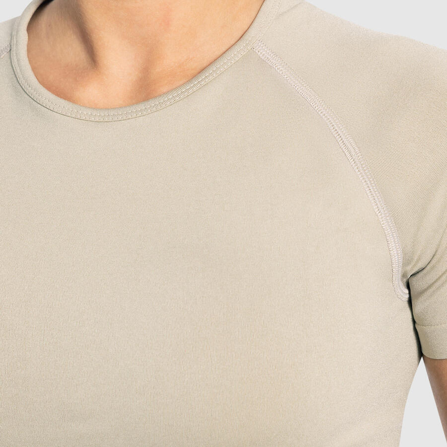 Этот женский укороченный топ сочетает в себе облегающий крой и классический круглый вырез. Широкий пояс с тонкими ребристыми вставками обеспечивает идеальную посадку, а материал приятен на ощупь. Короткие рукава и простой крой делают этот топ универсальным базовым предметом гардероба — он подойдёт для занятий в студии, тренировок или на каждый день.