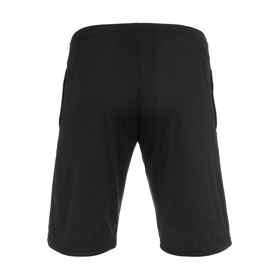 ЧЕРНЫЙ * Состав: 100% полиэстер (160 г/м², ткань для разминки) * Длина: короткая * Посадка: слегка приталенная * Застёжка: шнурок на талии * Детали: эластичный пояс, регулируемый шнурок, боковые карманы на молнии, эргономичная конструкция для большей свободы движений * Экологичность: сертифицировано по стандарту Oeko-Tex 100 * Применение: идеально подходит для интенсивных тренировок или отдыха. Эти унисекс-шорты-бермуды сочетают в себе комфорт и функциональность и подходят для любых видов спорта, не стесняя движений.