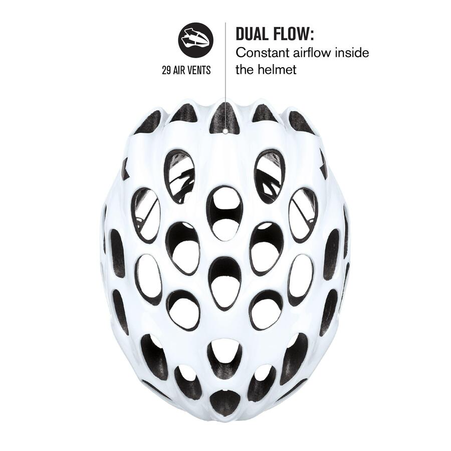Dualflow: Система Catlike Dual Flow обеспечивает максимальную вентиляцию: Внутренние каналы обеспечивают постоянный поток воздуха внутри шлема и предотвращают перегрев. Whisper содержит 37 вентиляционных каналов.