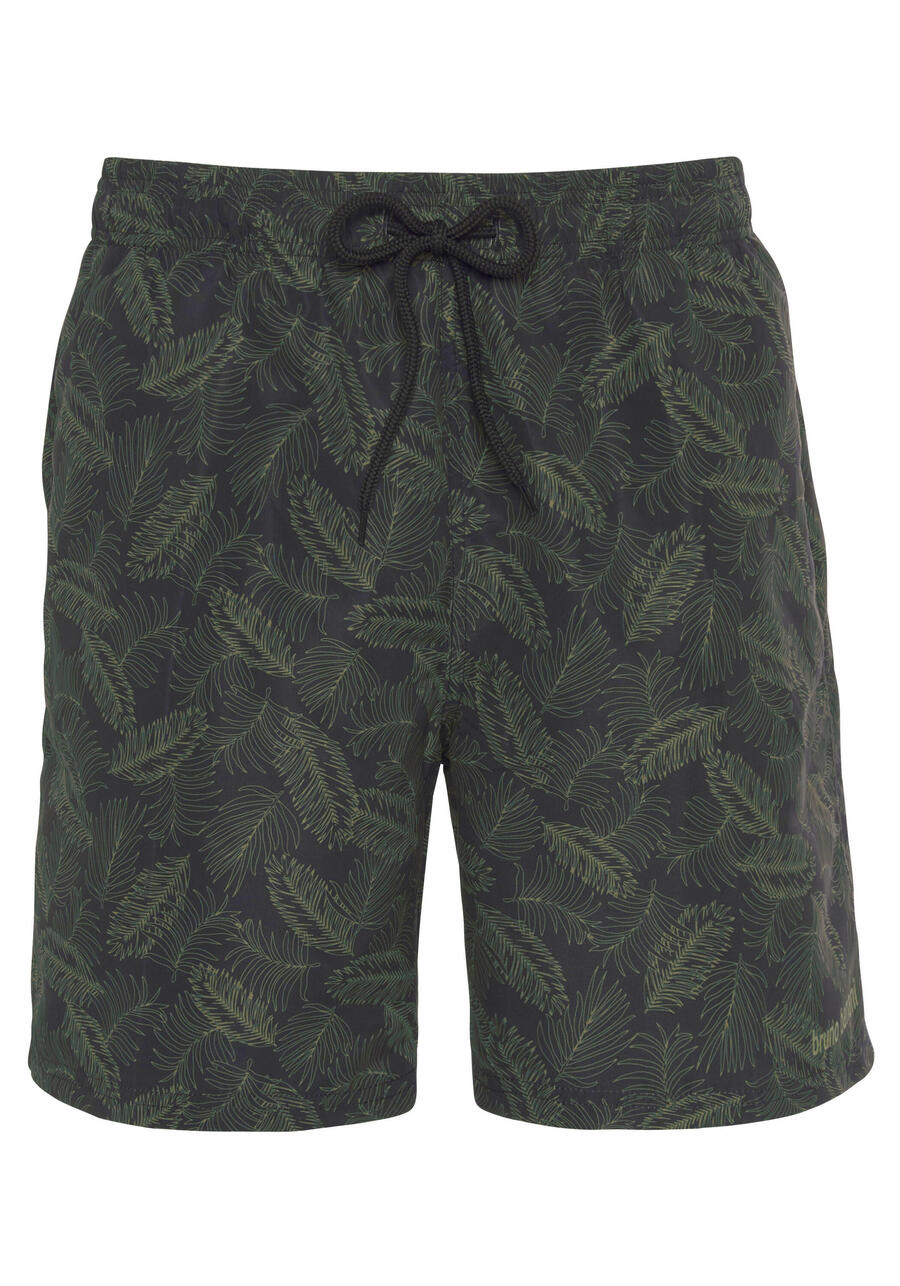 Плавающие шорты Bruno Banani с рисунком листьев. Эластичный пояс с завязками и видимым шнурком. Задний карман на липучке. Сетчатые трусики с внутренним карманом. Прямой крой. Мягкая микрофибра с добавлением переработанного полиэстера. MAY-171