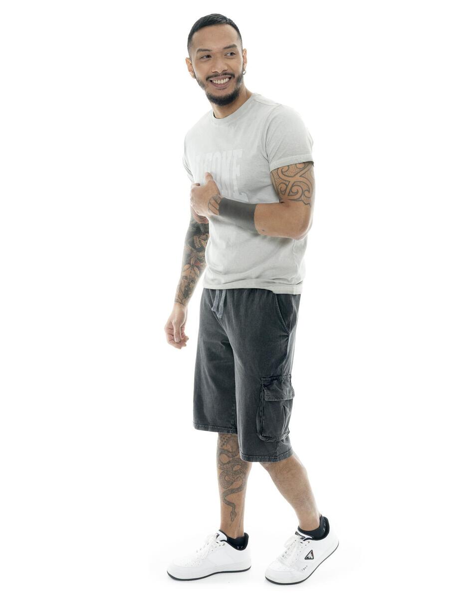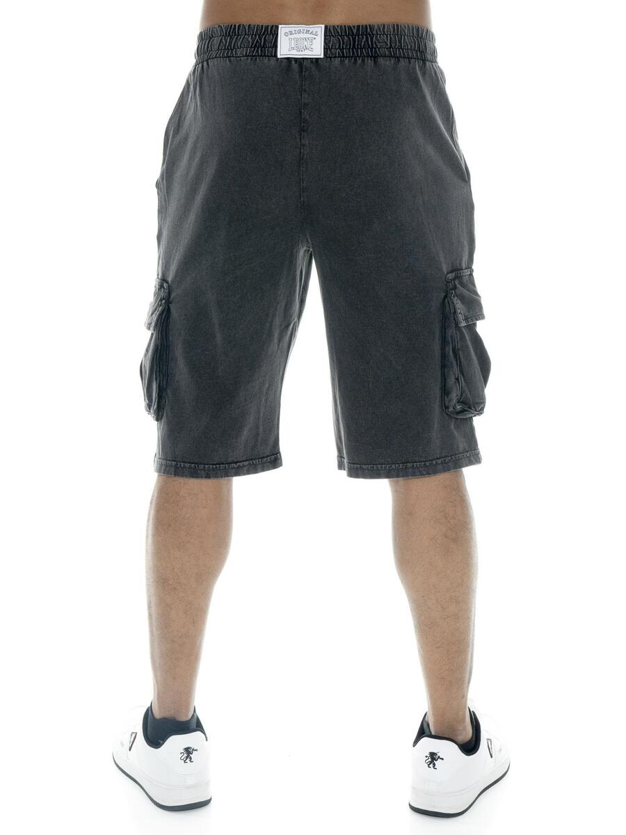Мужские шорты из стираного нечесаного хлопка. Эта обработка придает изделию винтажный, потертый вид, идеально подходящий для городского уличного стиля, но при этом сохраняющий спортивный характер. Два практичных кармана по бокам создают эффект карго. Пояс выполнен из эластичной резинки и оснащен регулируемым шнурком, скрытым внутри шорт.