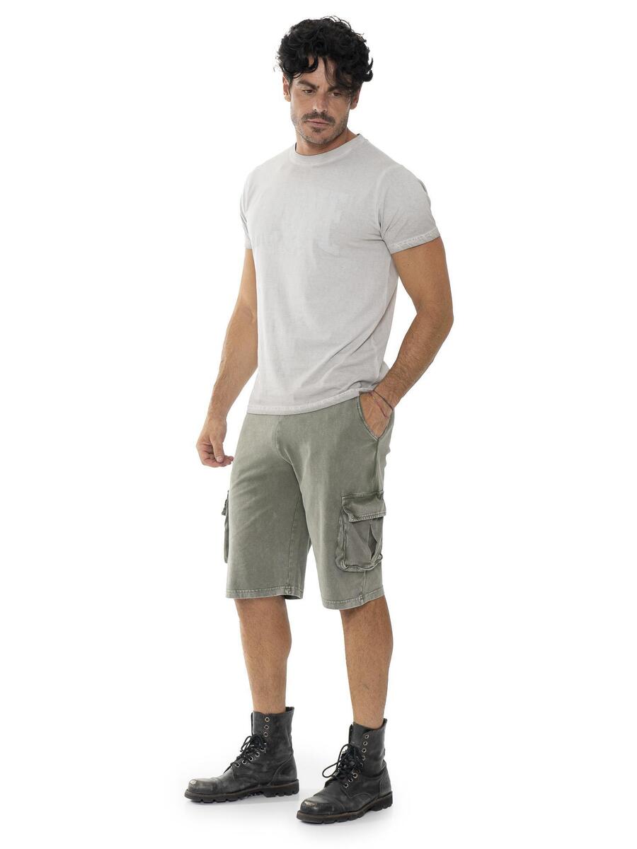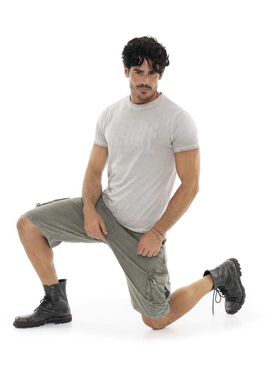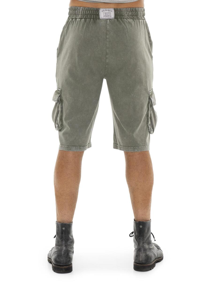 Мужские шорты из стираного нечесаного хлопка. Эта обработка придает изделию винтажный, потертый вид, идеально подходящий для городского уличного стиля, но при этом сохраняющий спортивный характер. Два практичных кармана по бокам создают эффект карго. Пояс выполнен из эластичной резинки и оснащен регулируемым шнурком, скрытым внутри шорт.