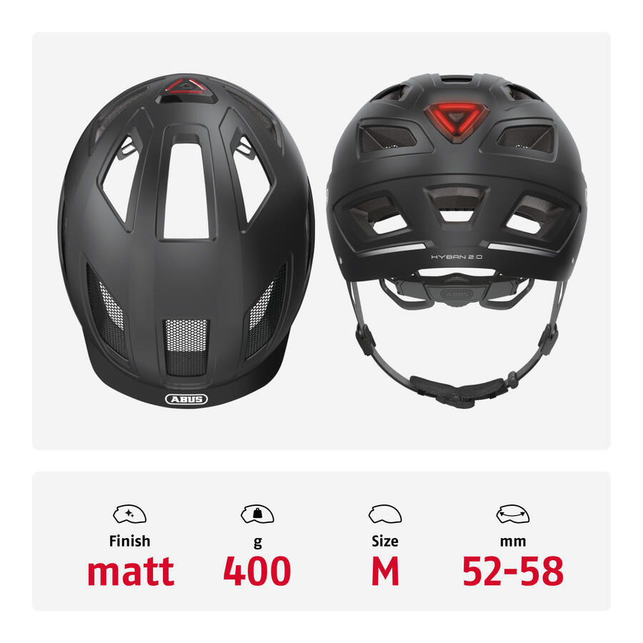ABUS Hyban 2.0Модель Hyban 2.0 от ABUS станет идеальным помощником для надежной защиты головы в городских джунглях. Жесткая оболочка из АБС-пластика надежно поглощает падения. Для обеспечения хорошей видимости в темноте велосипедный шлем оснащен ярким задним фонарем. Светоотражатели также улучшают видимость. Полный обод с точной системой регулировки обеспечивает идеальную посадку на голове и подбородке. ABUS Hyban 2.0 — высокая безопасность благодаря высокой видимости. Другие преимущества: Совместимость с прическами конский хвост: подходит для длинных волос, таких как косы. Полностью закрытое пластиковое кольцо с системой регулировки. С сеткой для москитов.