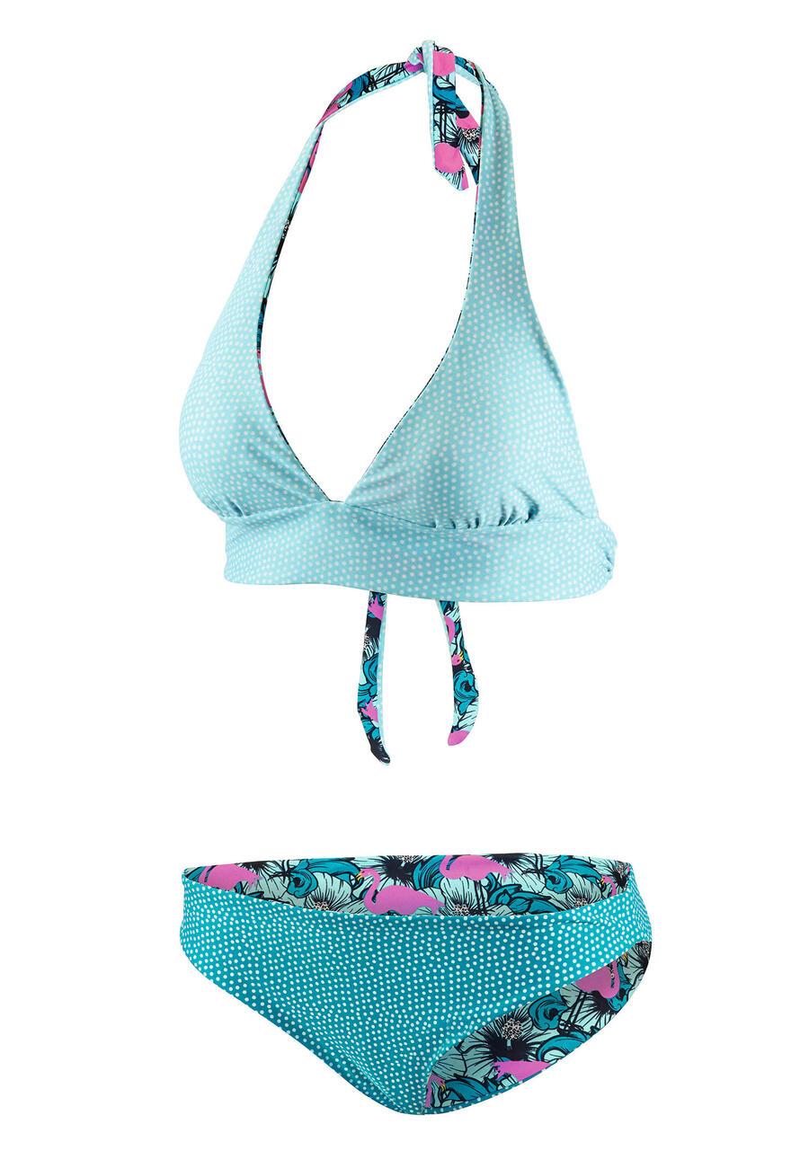 Ощутите двойной стиль и универсальность с двусторонним бикини BECO с завышенной линией талии "Flamingo Eden". Это уникальное двустороннее бикини предлагает вам два очаровательных образа в одном. Носите его на одну сторону с шикарным лифом-халтер, украшенным экзотическими бирюзовыми цветами и розовыми фламинго, для яркого и красочного образа. Или переверните его, чтобы насладиться более утонченной элегантностью в бирюзово-голубом цвете с мелким белым горошком. Плотные, полностью на подкладке и пришитые мягкие чашечки обеспечивают комфорт и поддержку, а верх с завышенной линией талии завязывается на талии. Он позволяет индивидуально регулировать грудь, создавая эффектные плечи и великолепное декольте. Плавки выполнены в современном хипстерском стиле, что добавляет дополнительный стильный штрих. В двустороннем бикини BECO с завышенной линией талии "Flamingo Eden" вы будете идеально подготовлены, чтобы блистать на любом пляже или в бассейне. Независимо от того, какую сторону вы выберете, вы, несомненно, будете выглядеть великолепно.