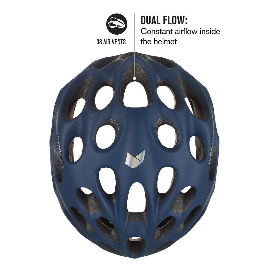 Mixino Evo был переработан для еще лучшей вентиляции. Почти 40% его передней поверхности открыто. 18 передних вентиляционных отверстий направляют поток воздуха вокруг головы велосипедиста через воздушные каналы, выводя тепло и пот через задние вентиляционные отверстия. Комфорт был улучшен за счет лучшей посадки благодаря системе MPS EVO Fit System и технологии MIPS Air Node, которая значительно повышает безопасность.
