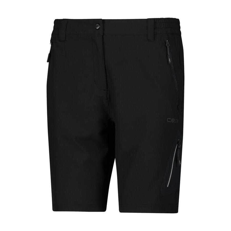 Женские бермуды CMP. Бермуды средней длины из ткани, растягивающейся в 4 стороны. Технология Dry Function способствует испарению пота и сохраняет тело сухим. Модель имеет эластичный пояс со шлёвками, два боковых кармана, задний карман на молнии и термокарман на штанине. Идеальная одежда для активного отдыха на свежем воздухе. Состав: 89% полиэстер, 11% эластан.