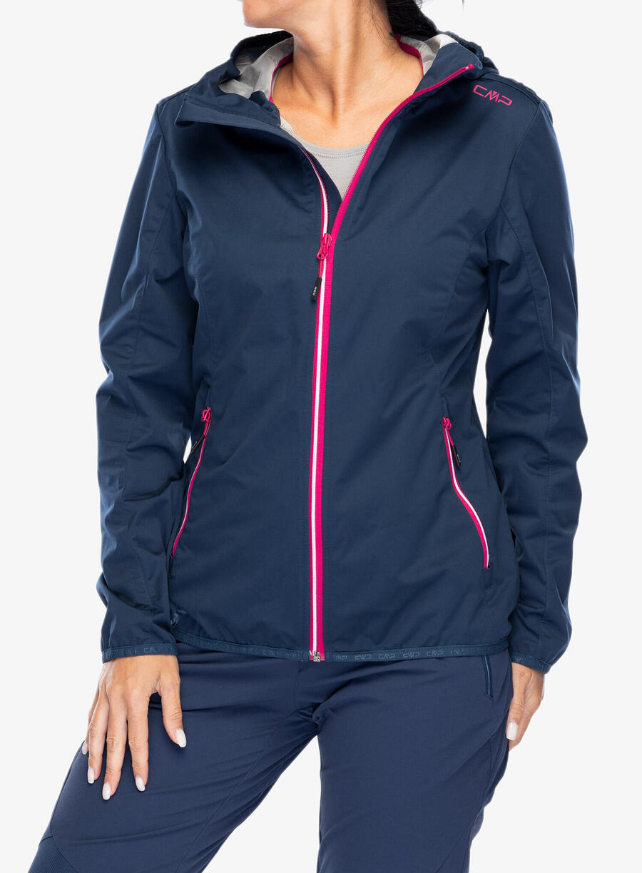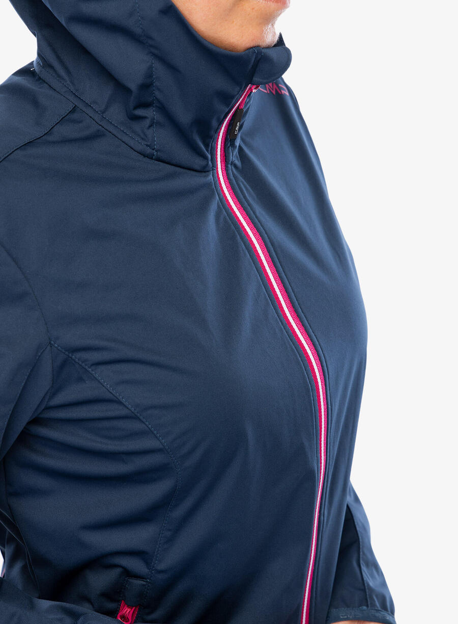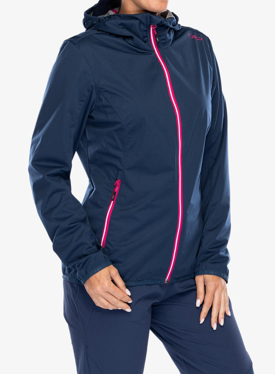 Женская куртка софтшелл CMP с фиксированным капюшоном. Лёгкая, ветро- и водонепроницаемая куртка софтшелл с фиксированным капюшоном. Куртка имеет высокий воротник с защитой подбородка и боковые карманы на молнии. Материал: 100% полиэстер.
